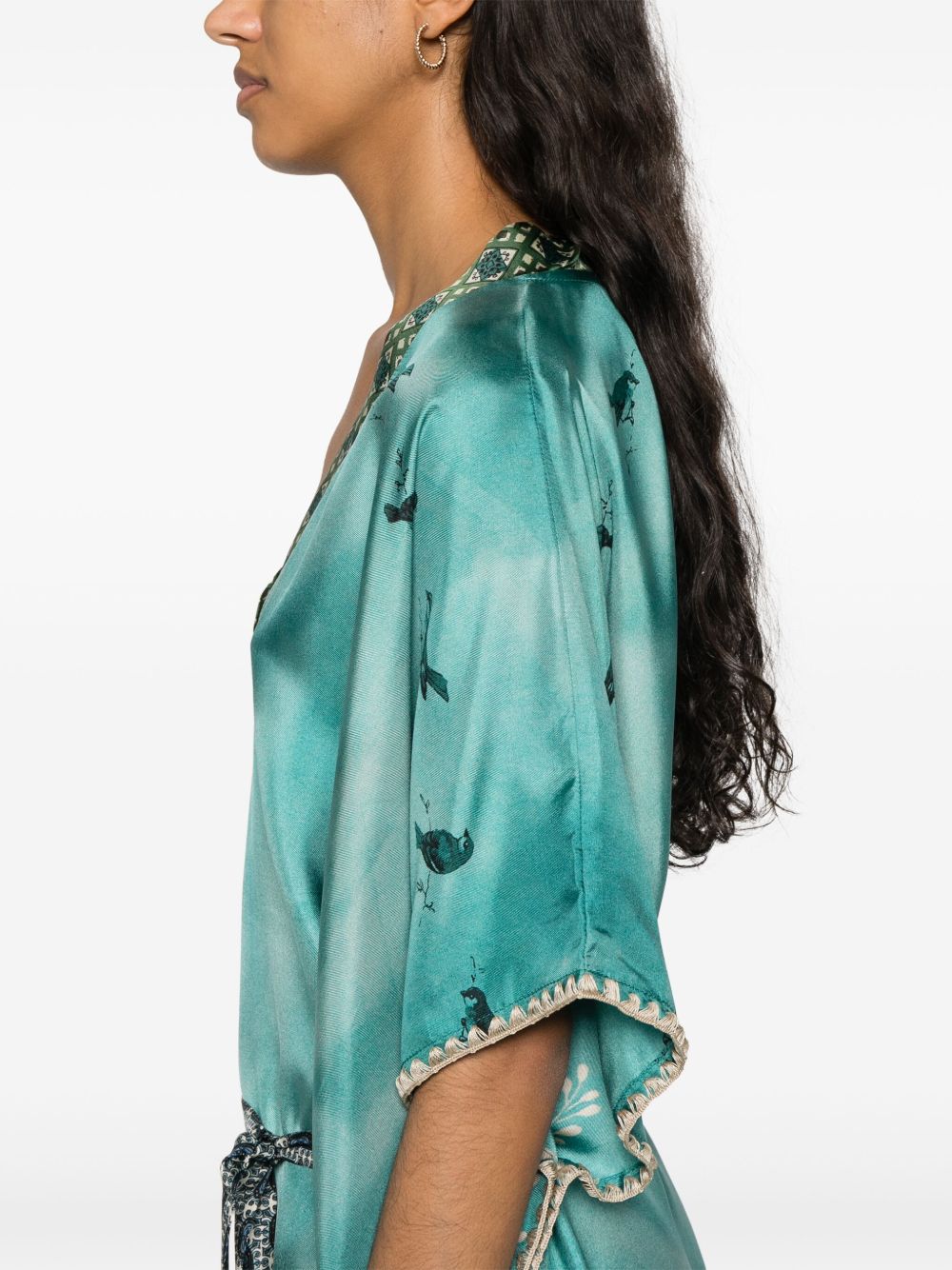 teal blue detachable waist belt all-over graphic print V-neck contrasting trim