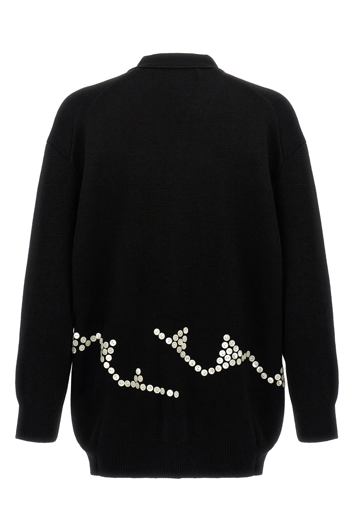 Wool blend sweater with all-over button detail, button closure, long cuffed sleeves.