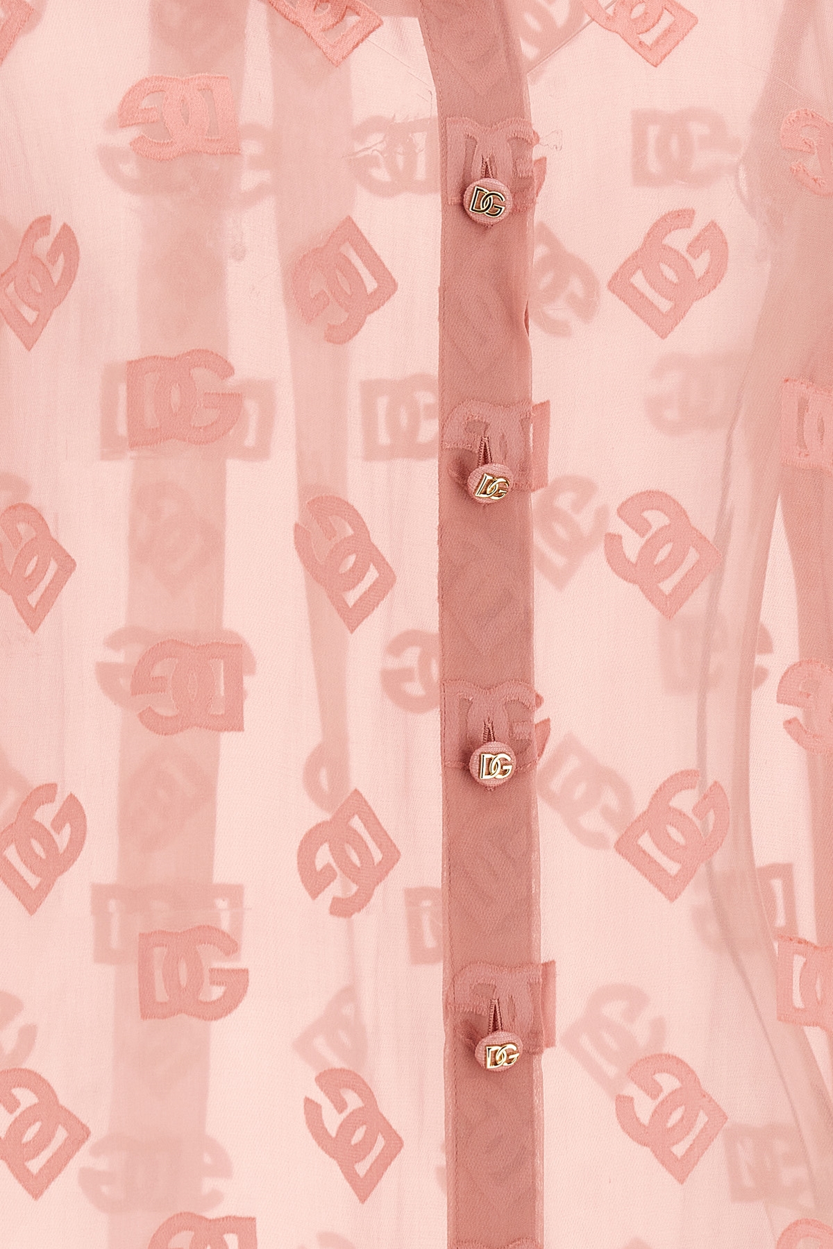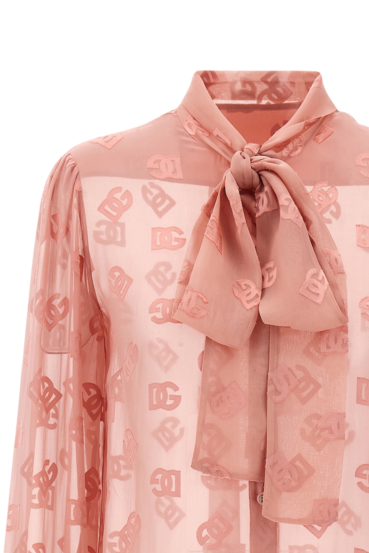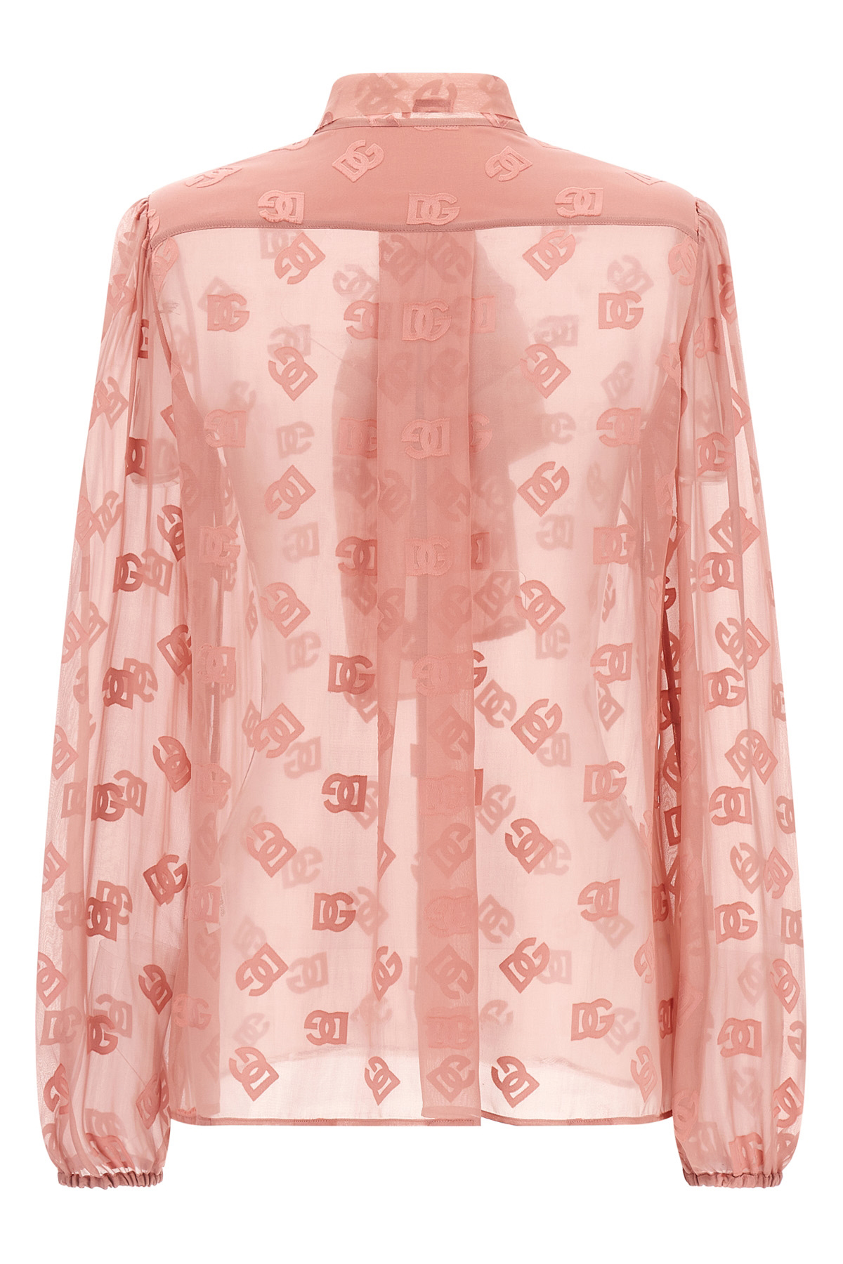 Devore silk satin shirt with all-over DG logo, lavalliere collar, button closure, long sleeves with elastic cuffs.