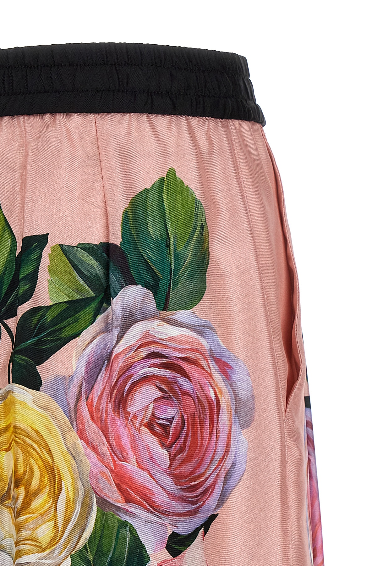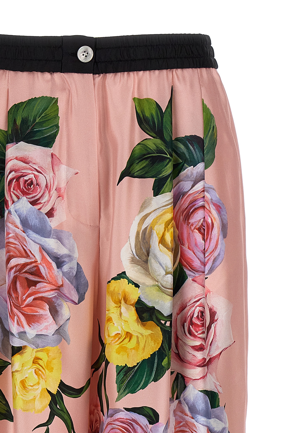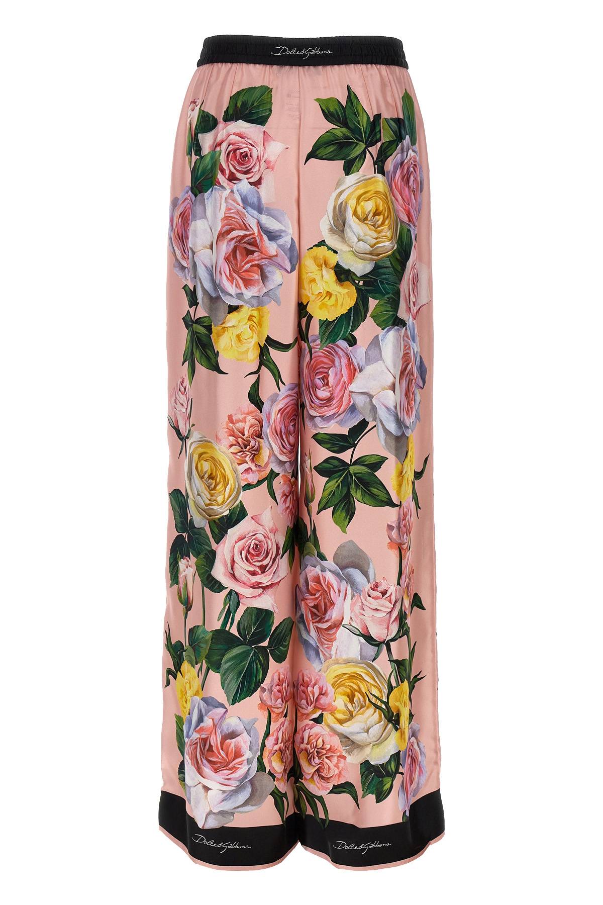 Floral-print stretch silk charmeuse trousers, solid satin piping, pajama style with wide leg, elastic waistband, pockets.