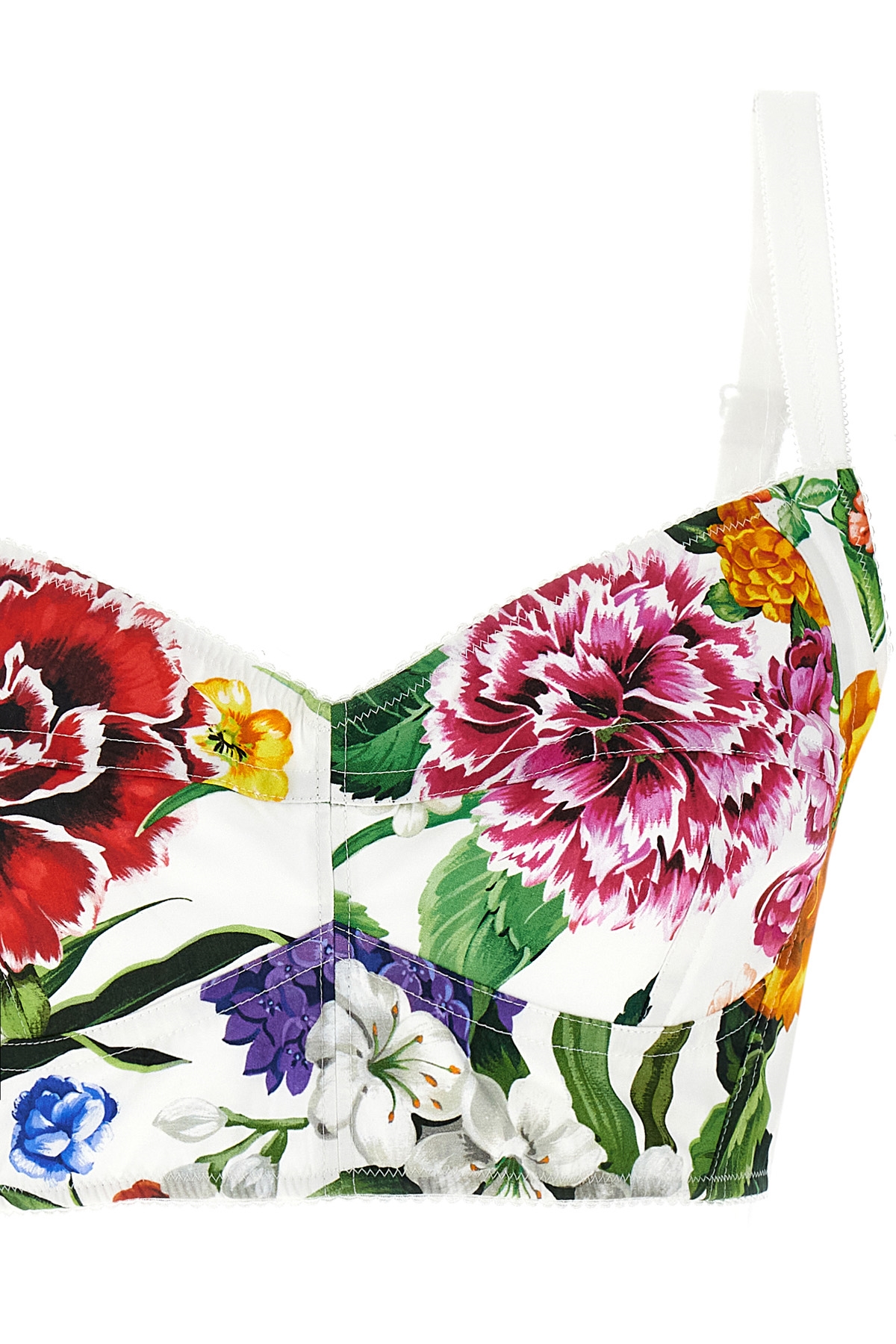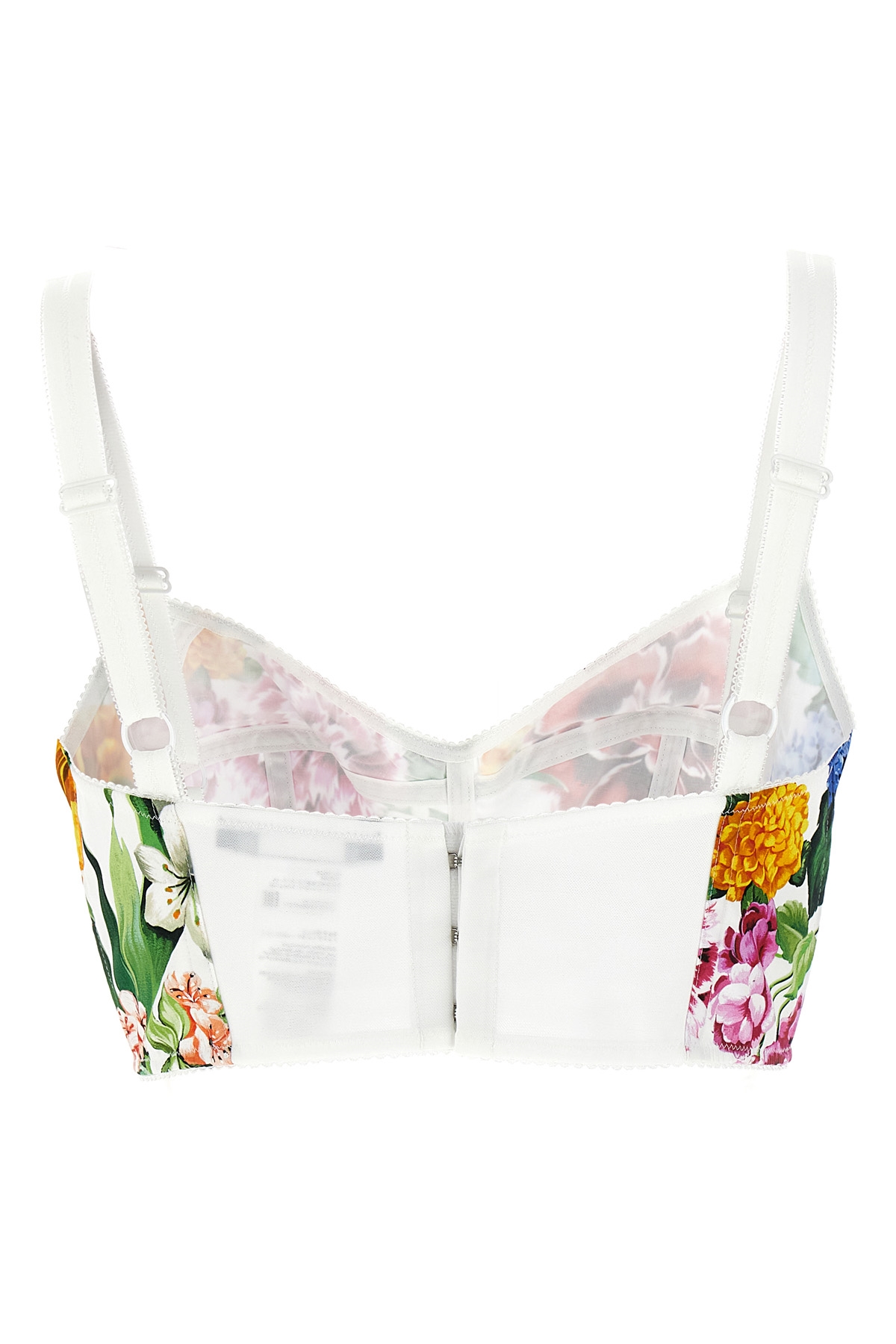'Bouquet' print bustier top, sweetheart neckline, thin adjustable straps, back hook closure.
