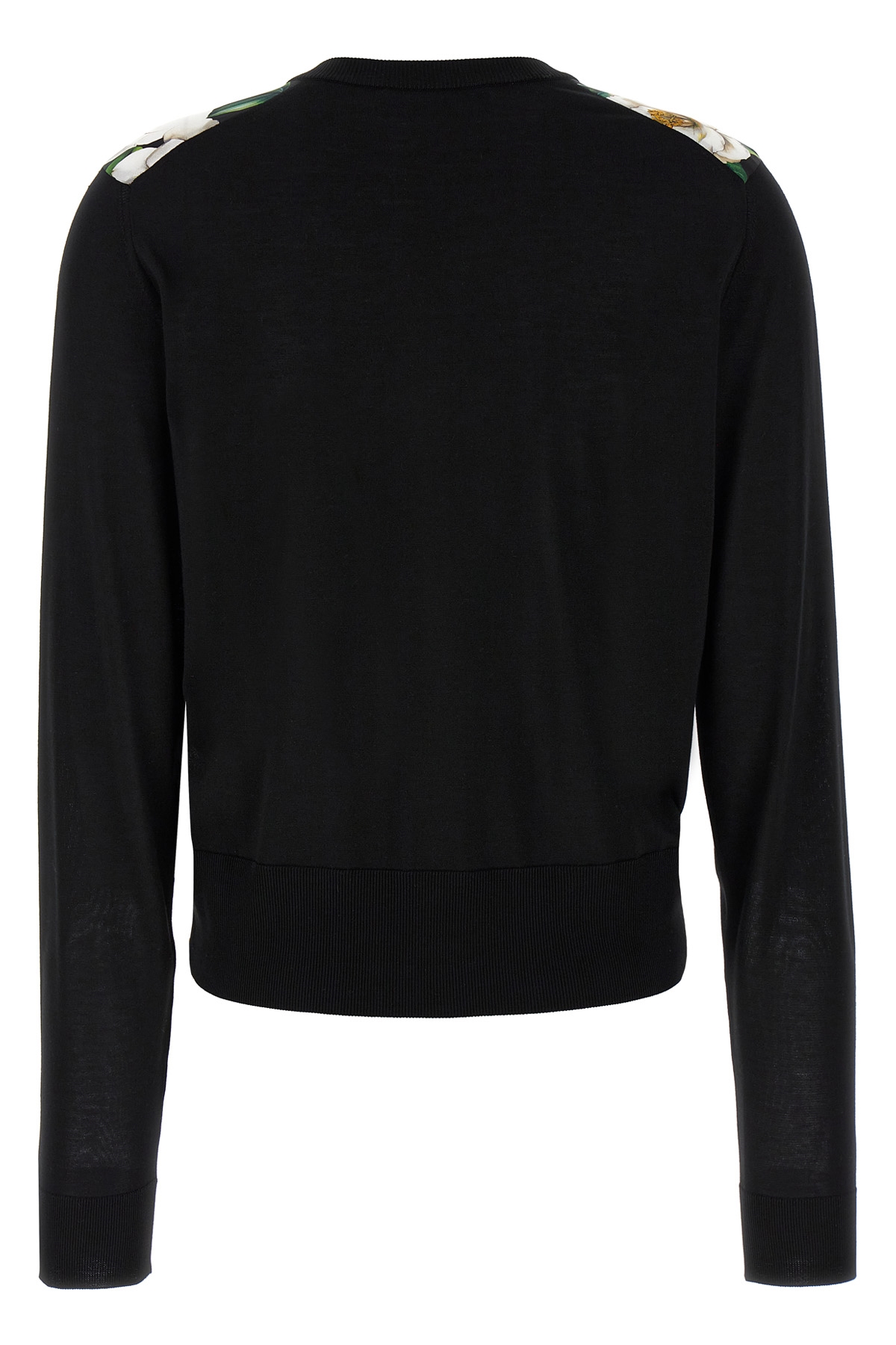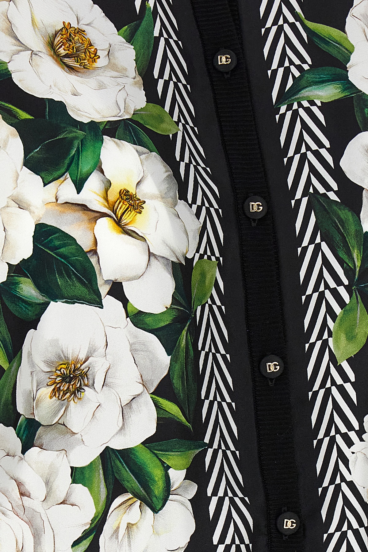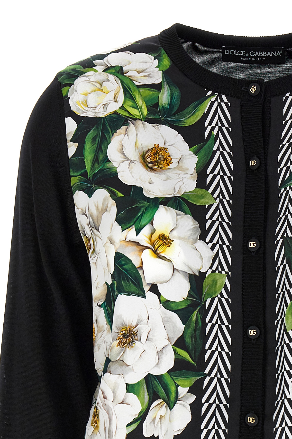 Cotton cardigan with front panels in stretch silk charmeuse with floral print, button closure, crew neck, long sleeves with cuffs.