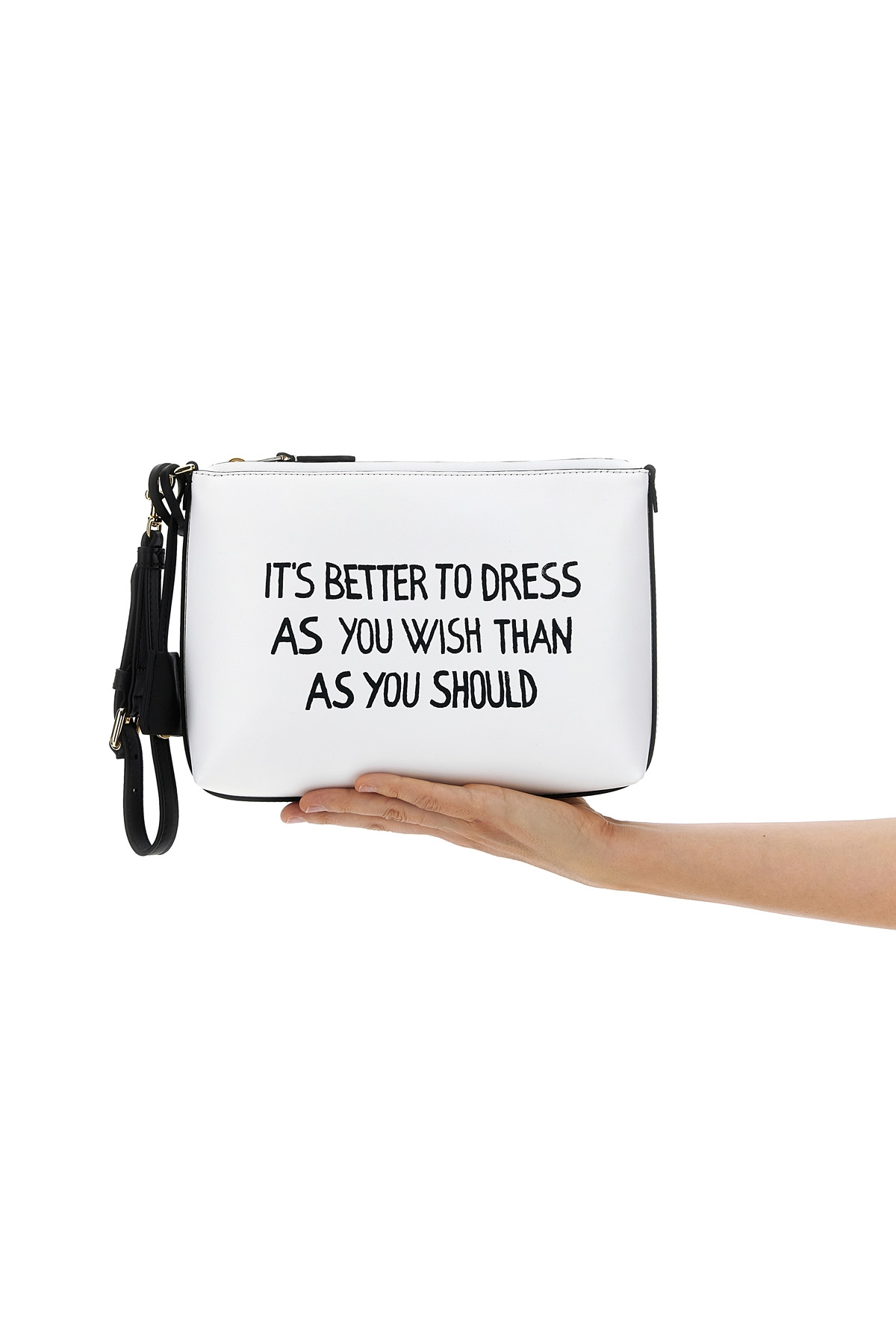 'Bustina' leather clutch bag with front logo print, zip closure, leather handle with adjustable buckle.