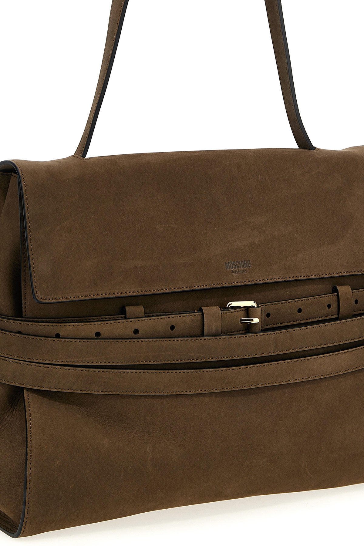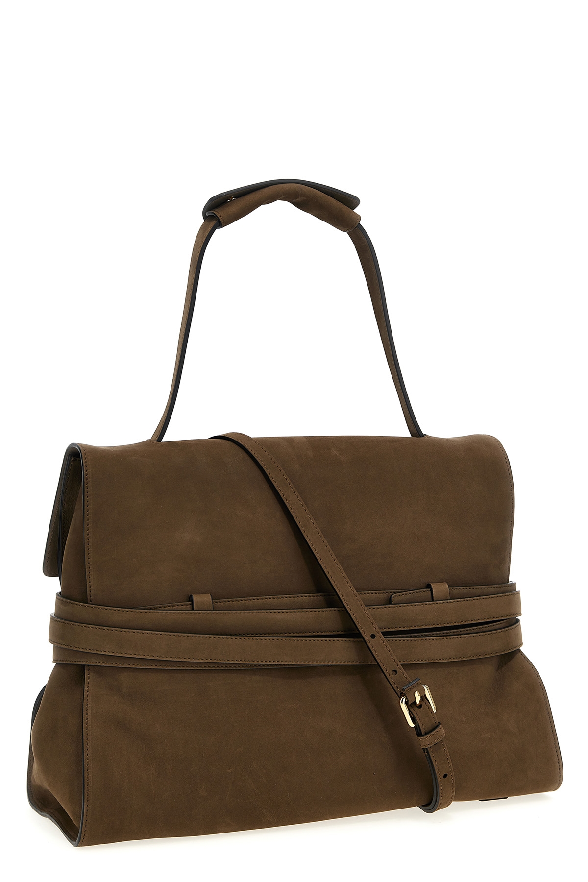 Tie Me' suede bag with fixed handle, removable shoulder strap, magnet button closure, buckle strap detail.