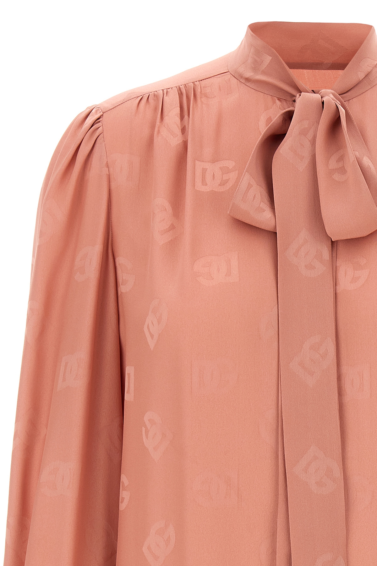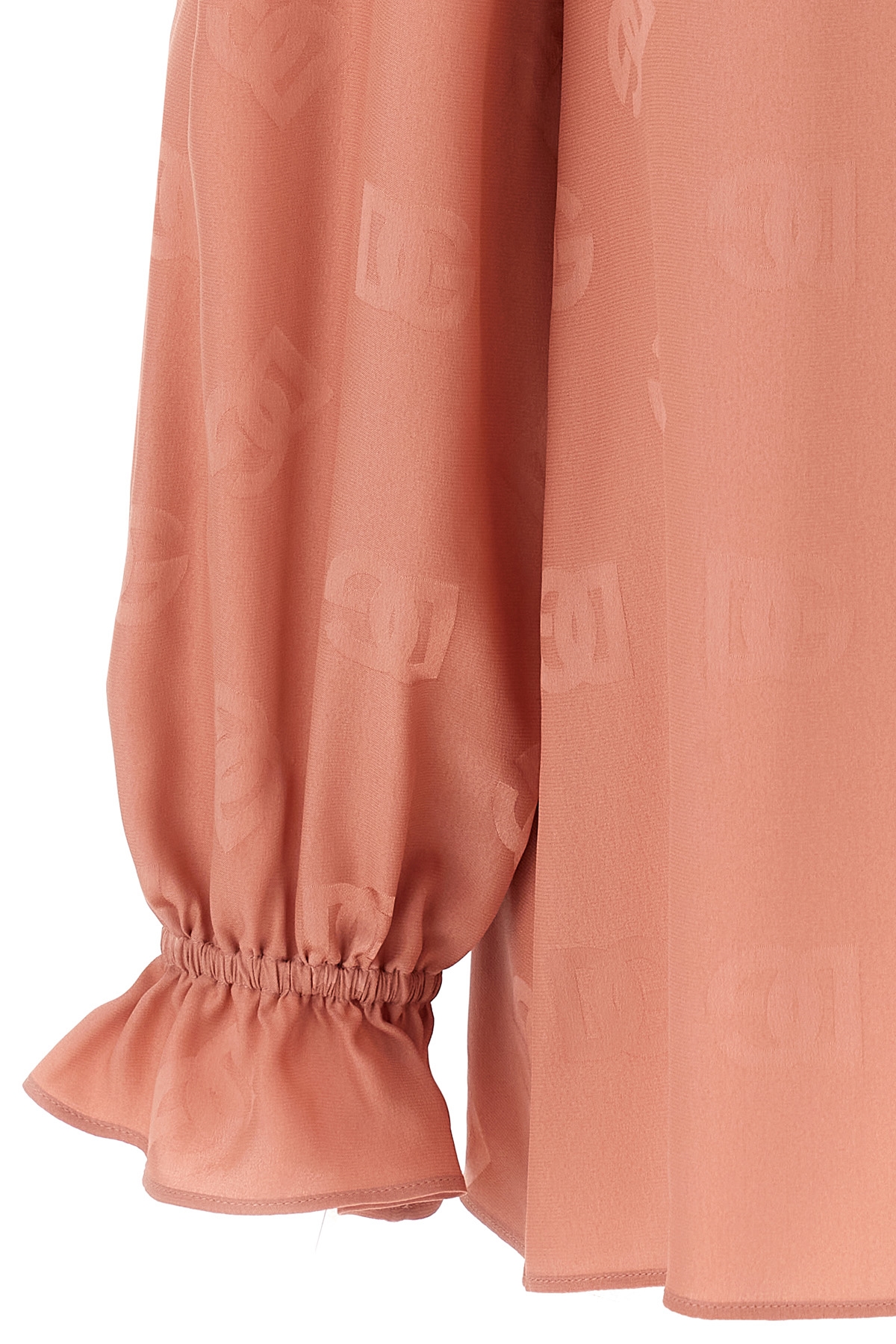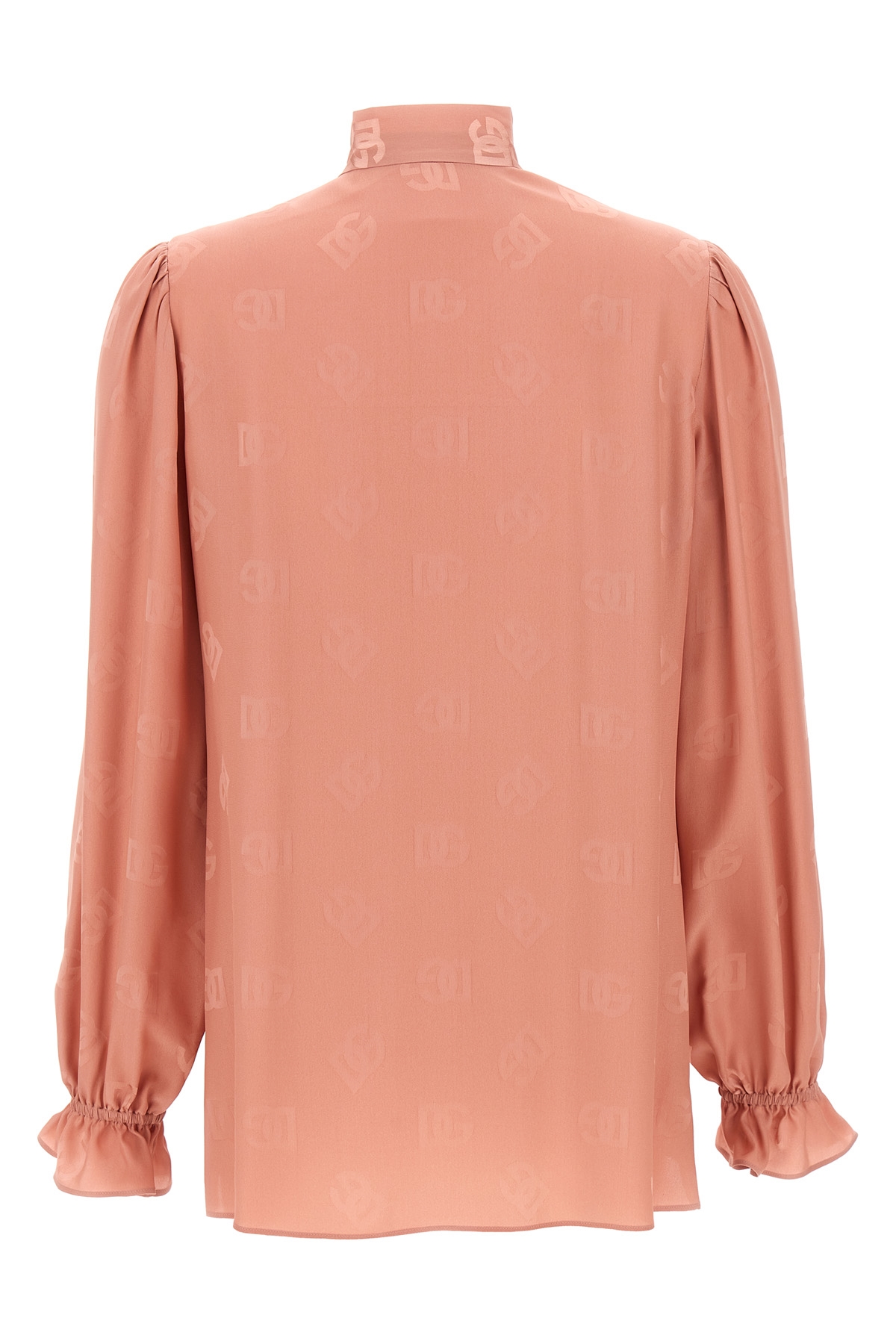 Silk shirt with all-over DG logo, lavalliere collar, button closure, long sleeves with elastic cuffs and ruffles.