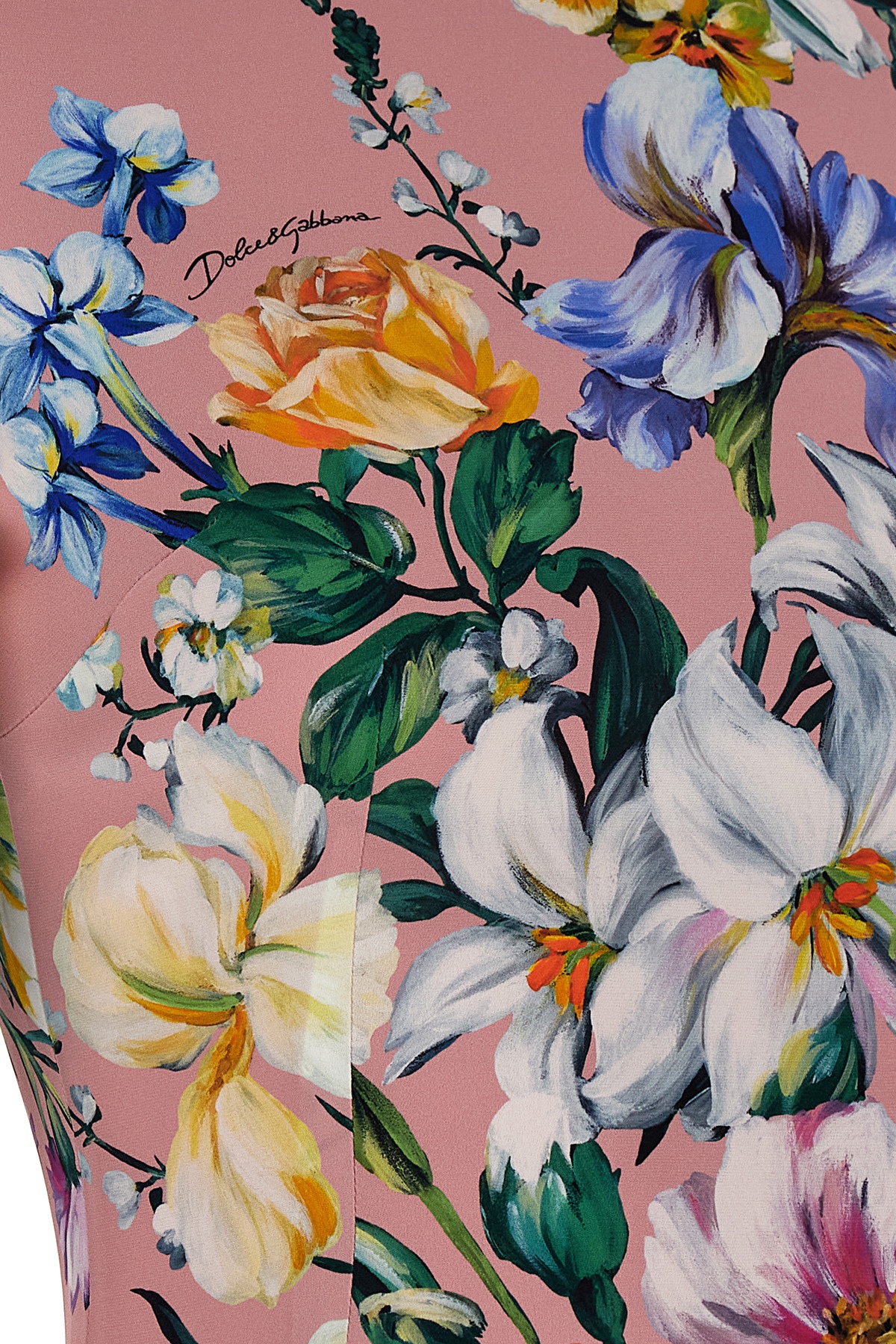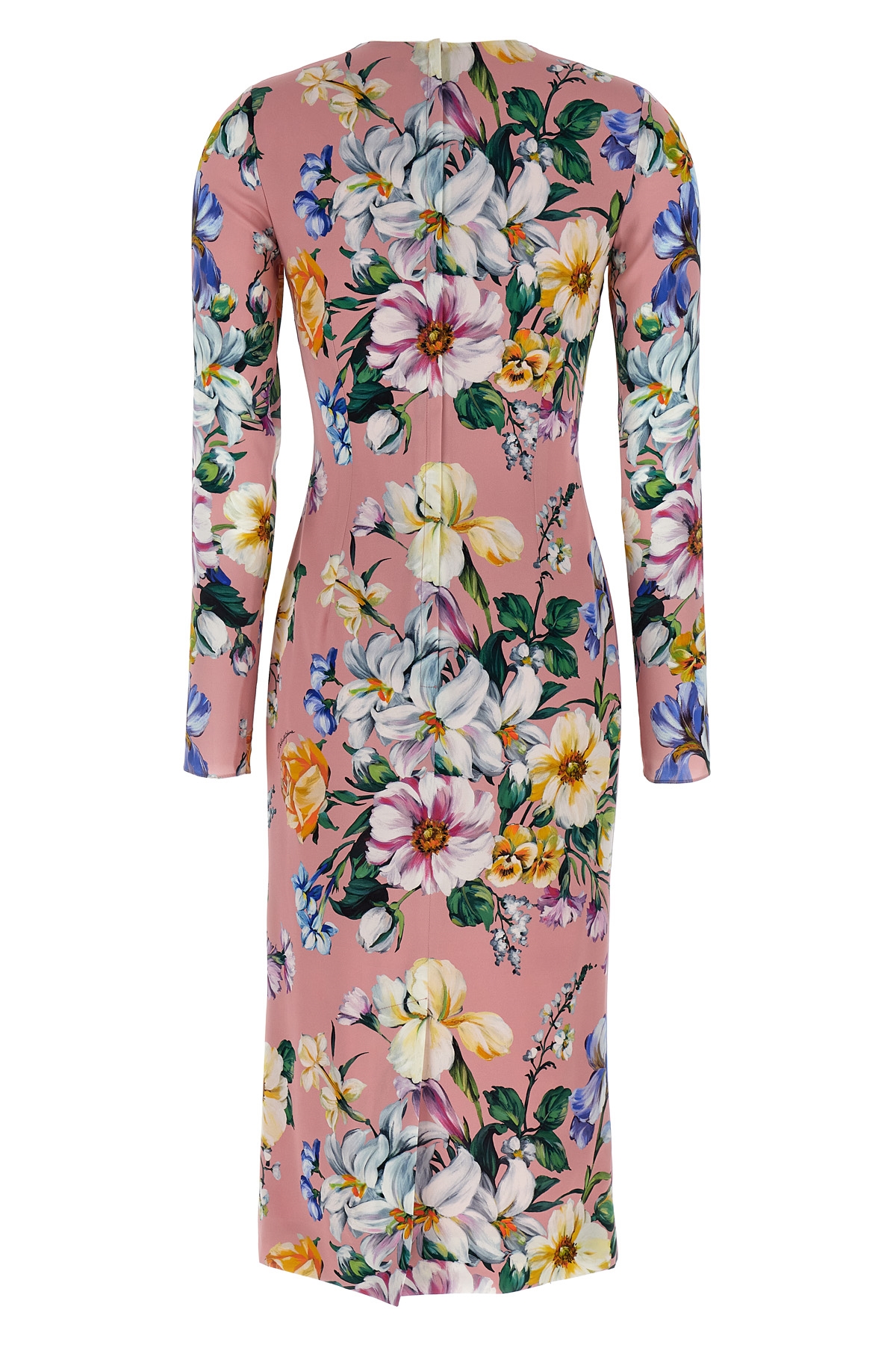 Longuette sheath dress in stretch silk charmeuse with flower print, crew neck, long sleeves, zip closure and back split.