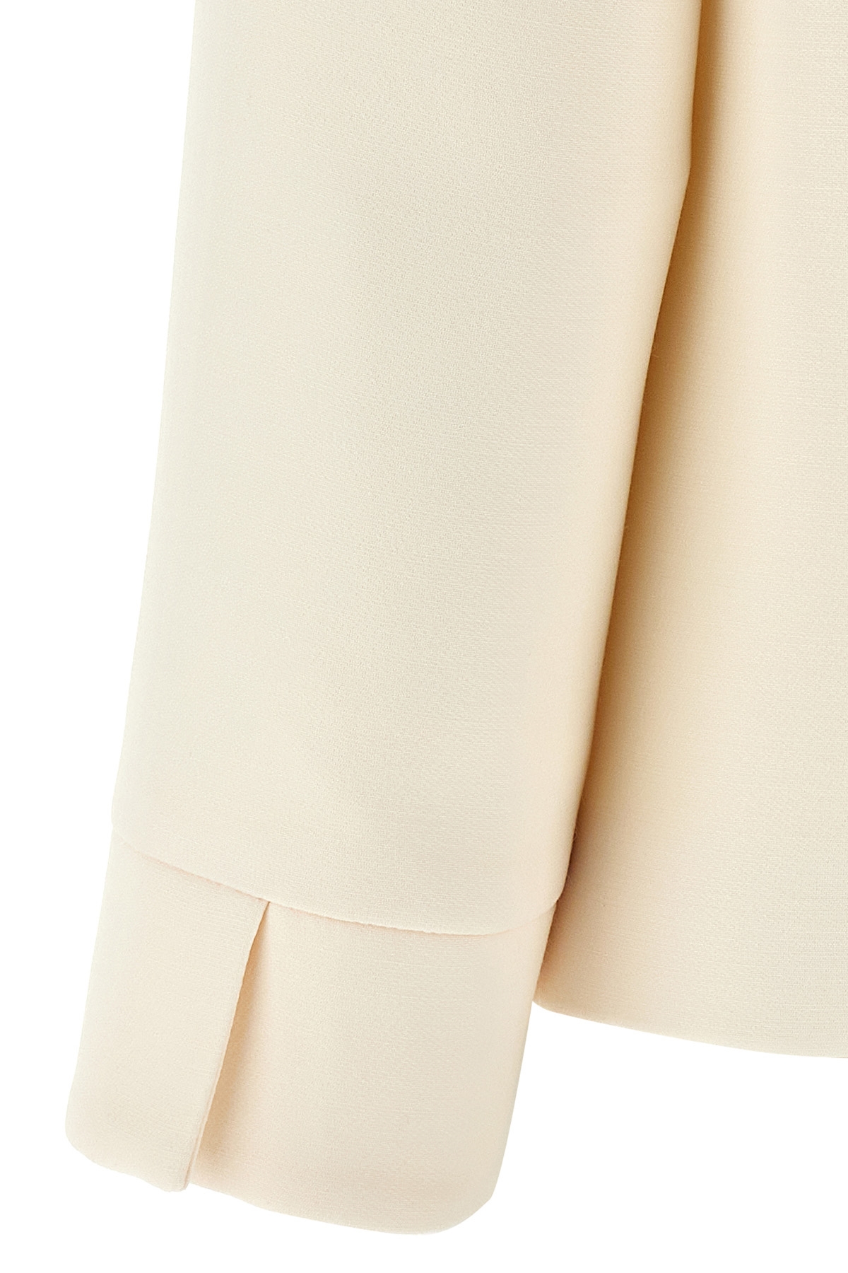 Wool crepe jacket with round neckline with collar, jewel button, front pockets, slightly flared, 3/4 sleeves with slit.