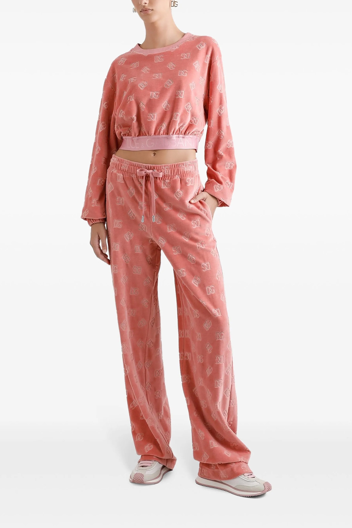 Chenille sweatshirt with all-over DG logo jacquard, cropp model with elastic waistband on the hem, crew neck, long sleeves with elastic cuffs.