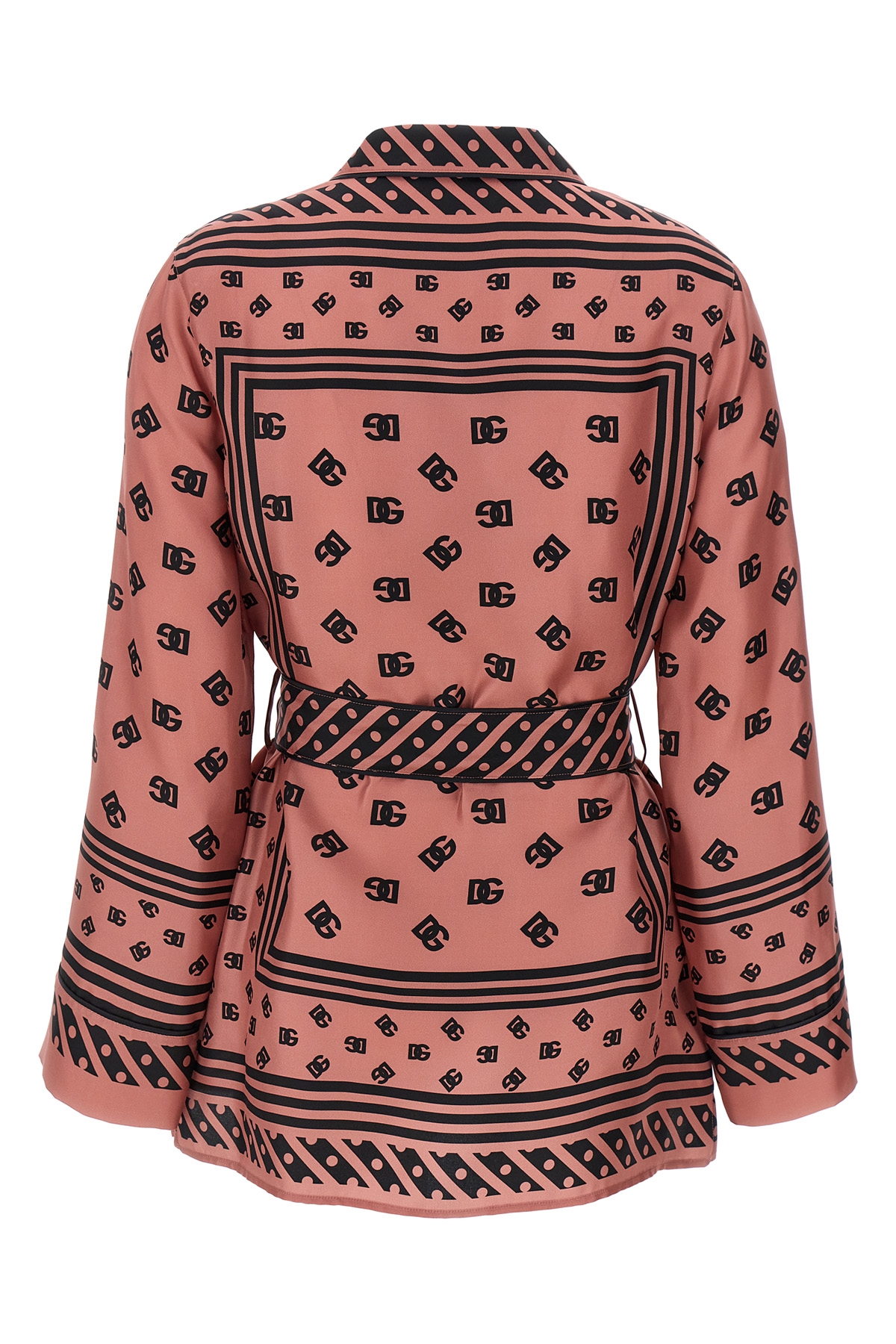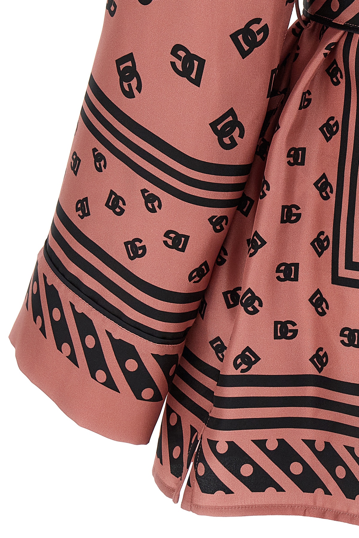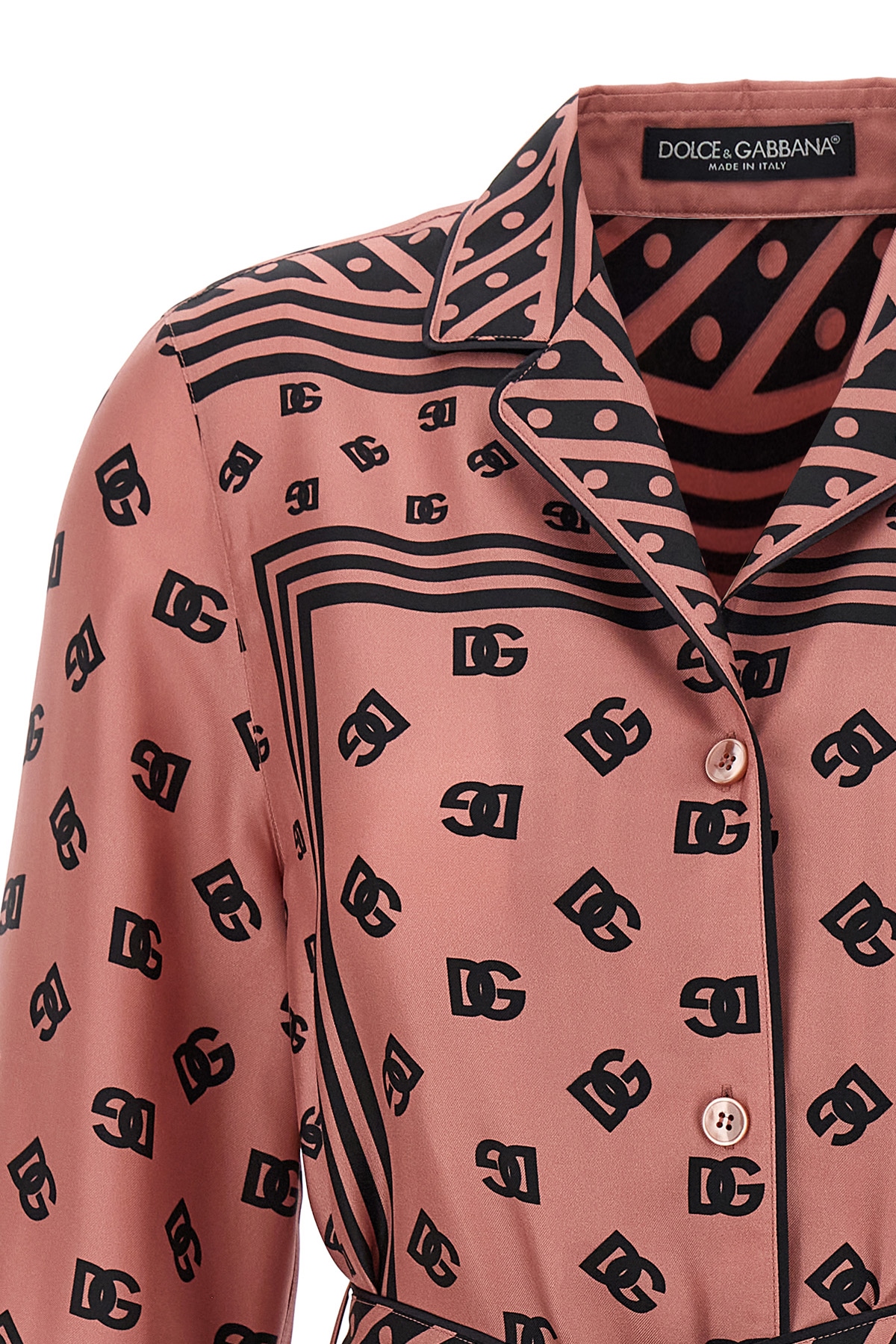 All-over DG logo scarf print silk twill shirt with contrast piping, pajama model, button closure, pockets, long sleeves, removable belt.