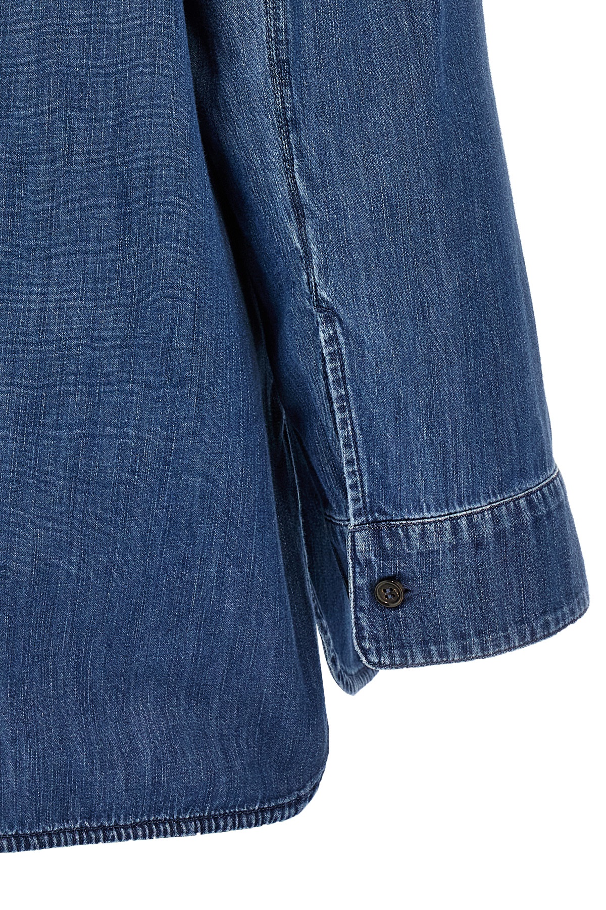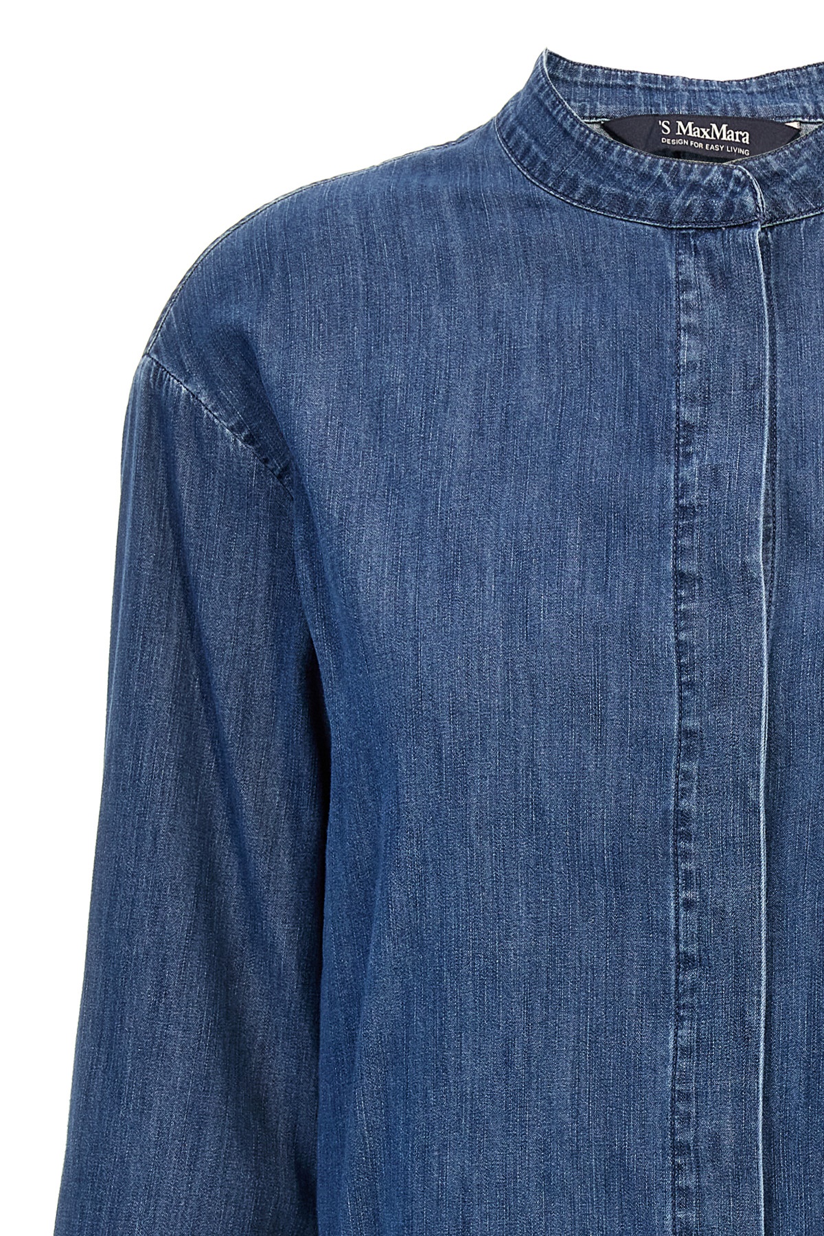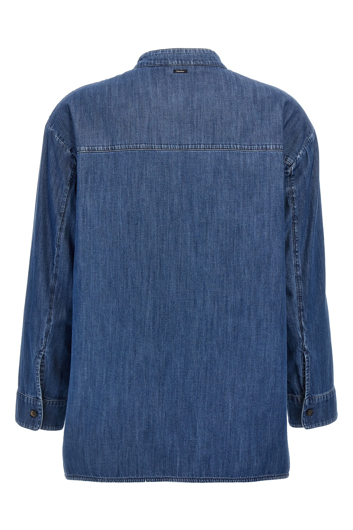 'Unito' cotton denim shirt with mandarin collar, front button closure, front pocket, side slits, long cuffed sleeves.