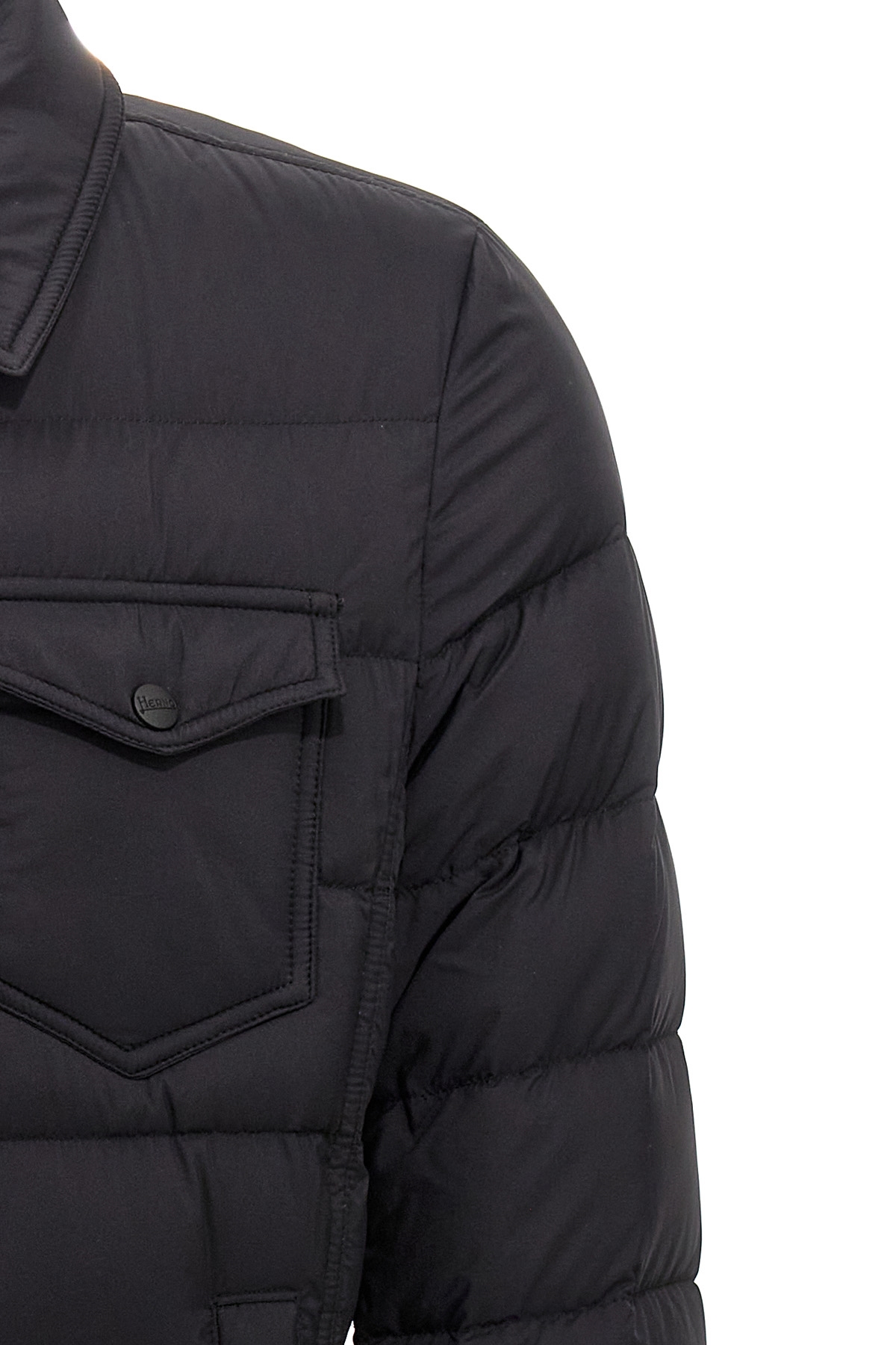'La Denim' down jacket in Nuage 20 denier nylon with goose feather padding, button closure, pockets, long sleeves.