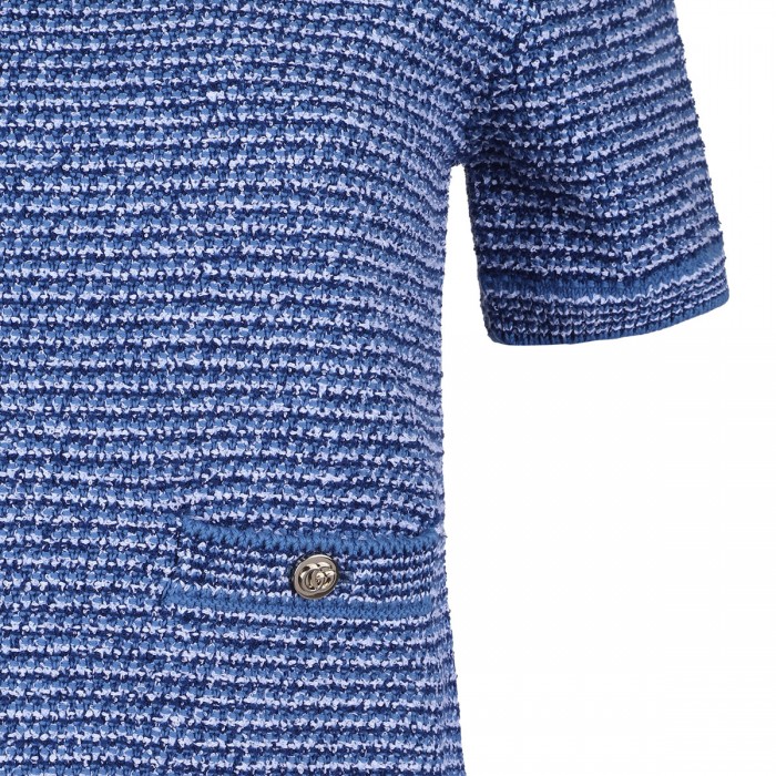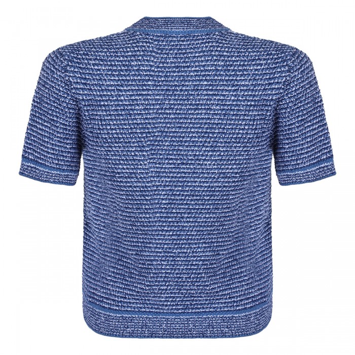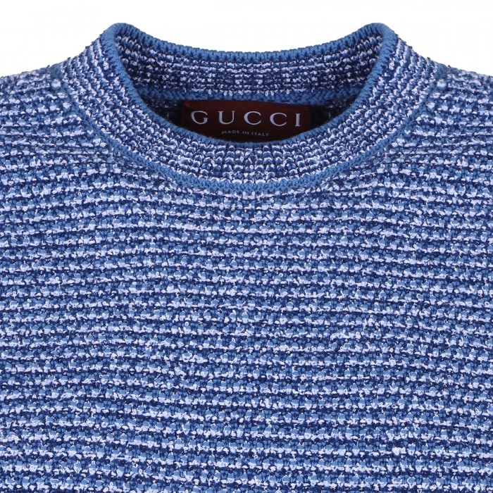 Light blue fine cotton top from Gucci featuring Light blue trims, gold-toned Double G buttons, crewneck, short sleeves, front pockets, ribbed knit trims.