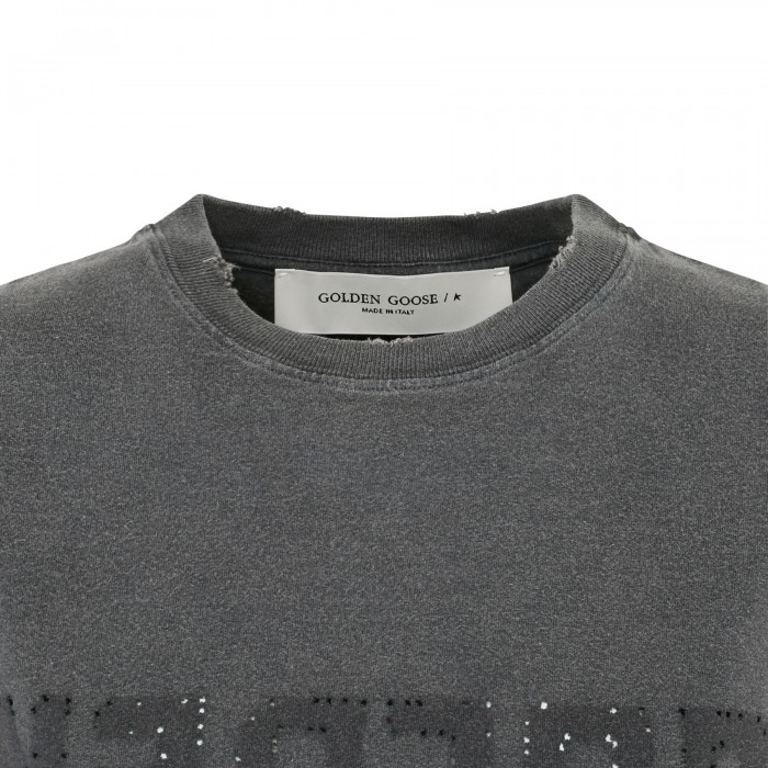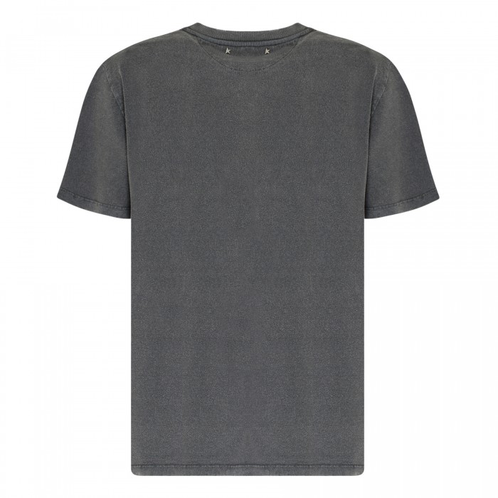 Anthracite-gray cotton T-shirt from Golden Goose featuring distressed treatment, Golden logo printed on front, detachable white patch with an embroidered letter G in red, short sleeves, ribbed crew collar.