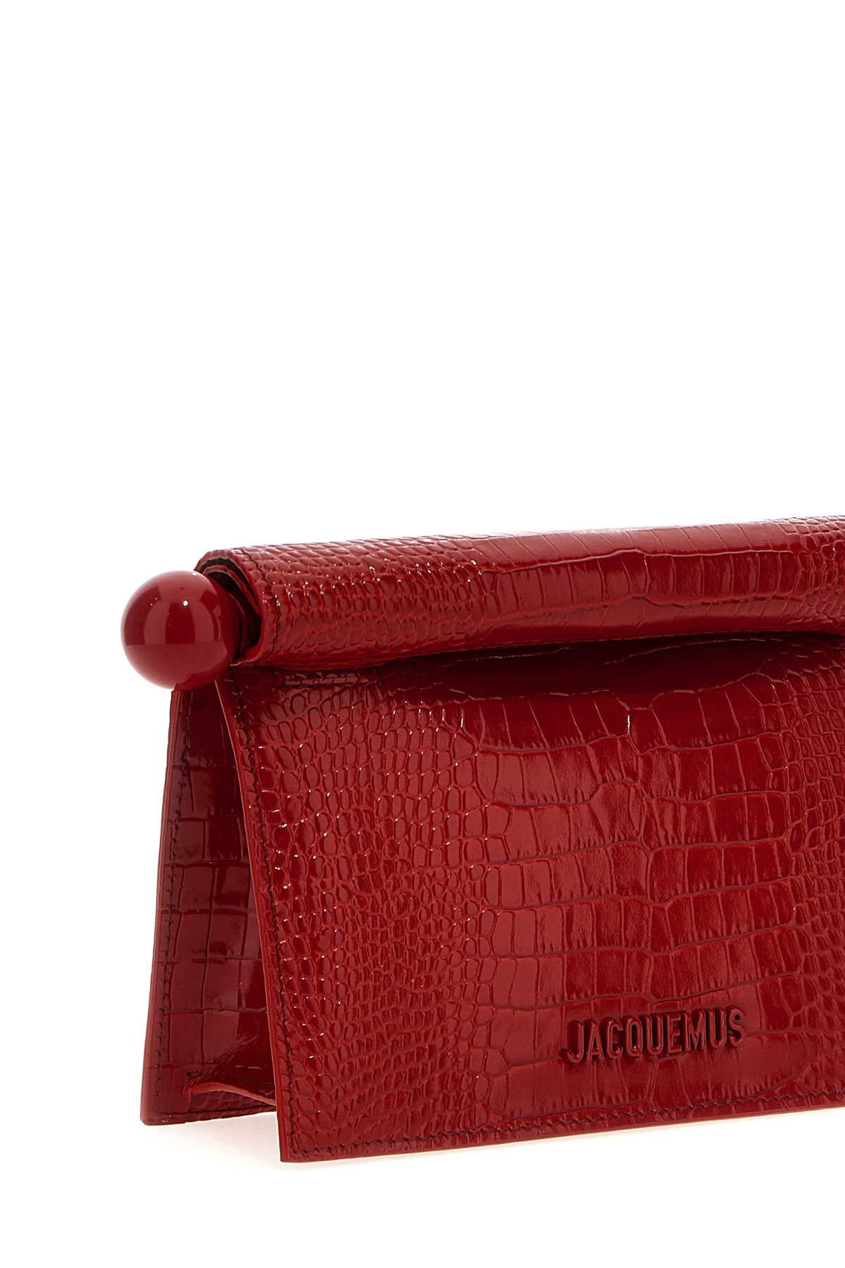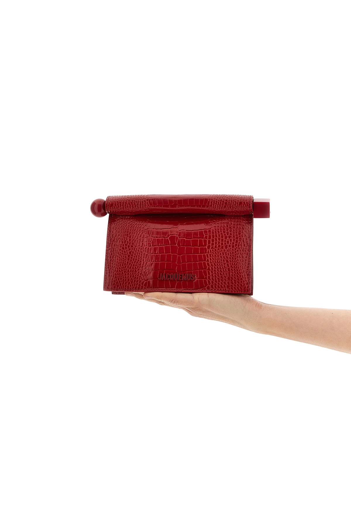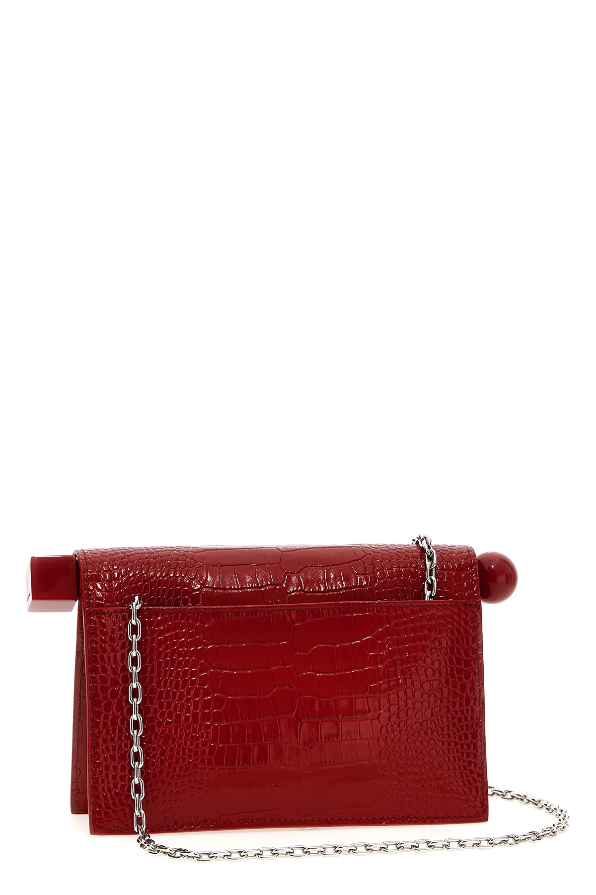 'La Petite Pochette Rond Carre' leather clutch bag with glossy crocodile effect effect, magnetic closure, metal sphere and cube detail, front metal logo, chain shoulder strap.