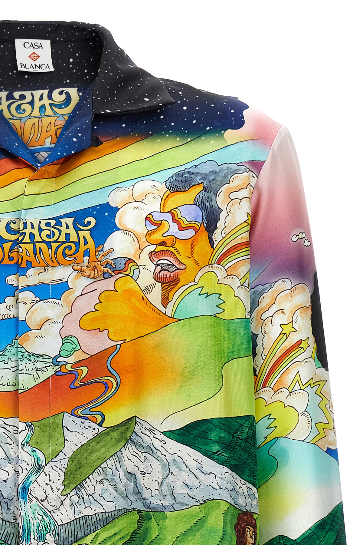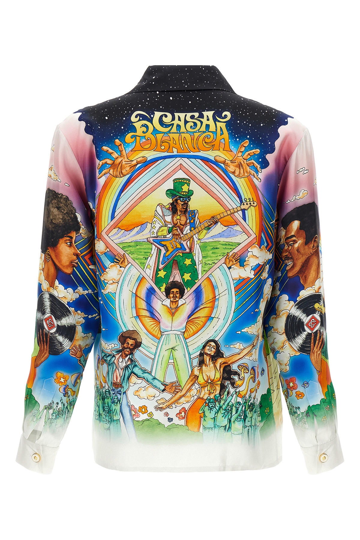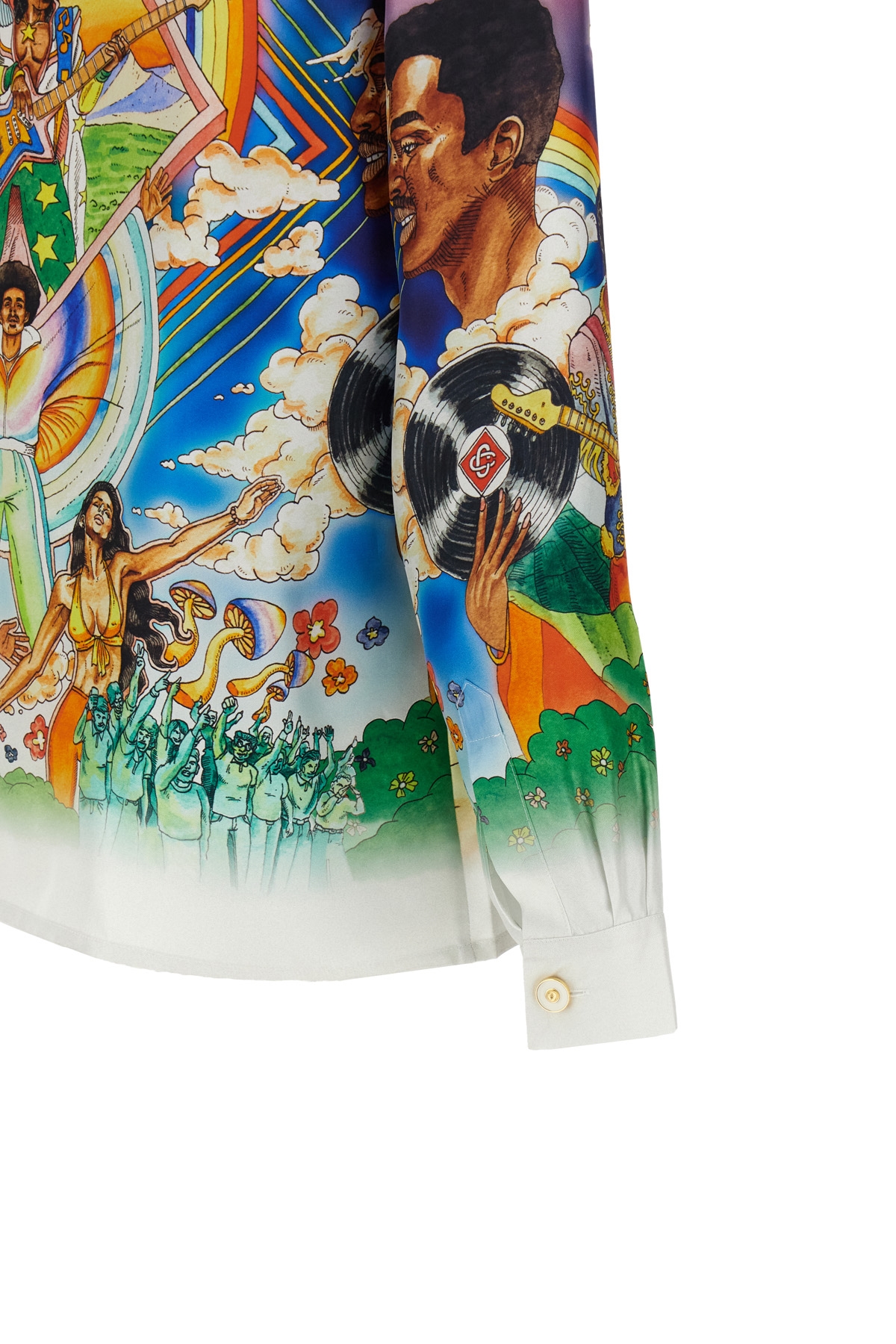 All-over 'La Musique' print silk shirt, button closure, chest pocket, long cuffed sleeves.