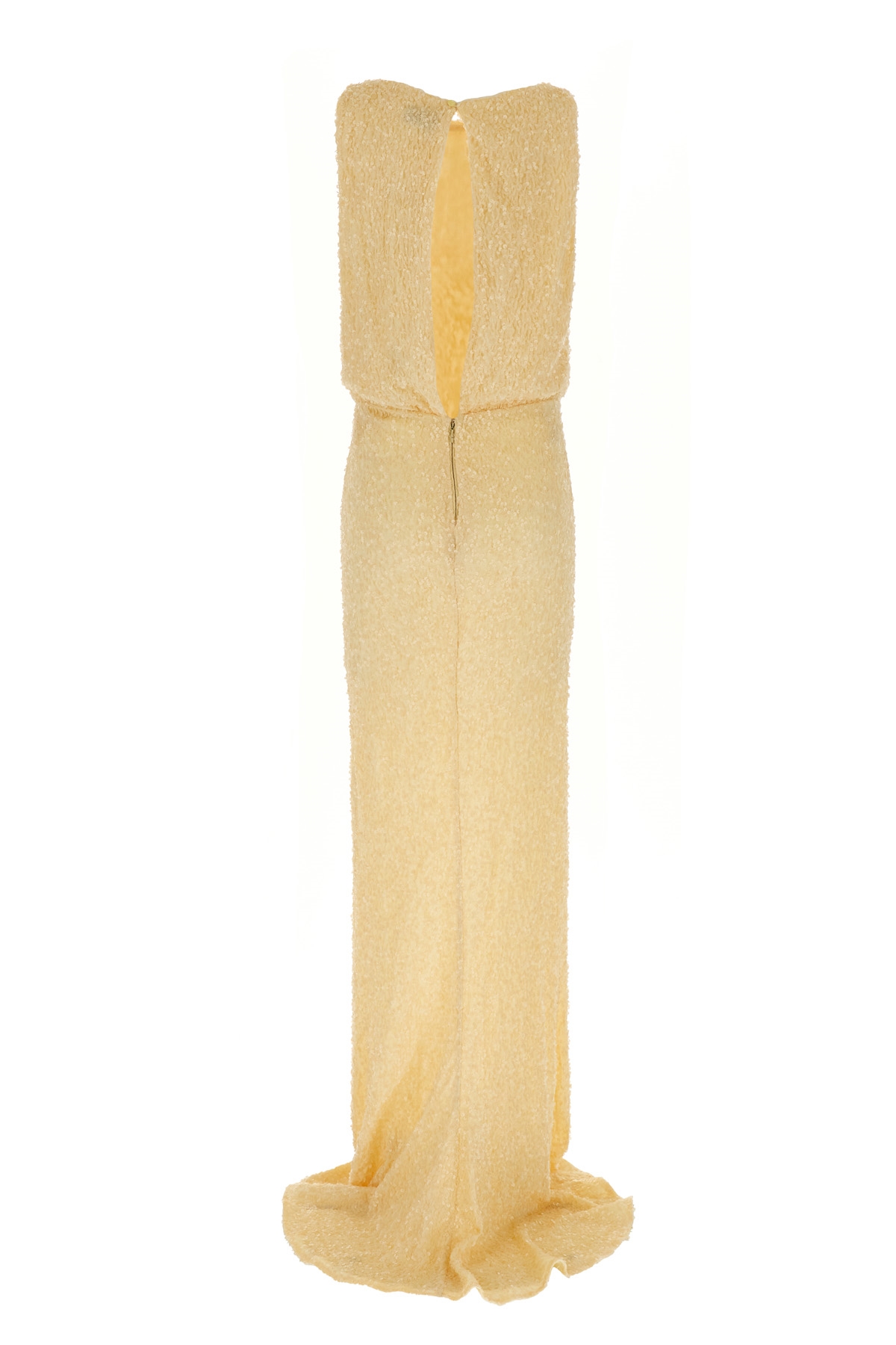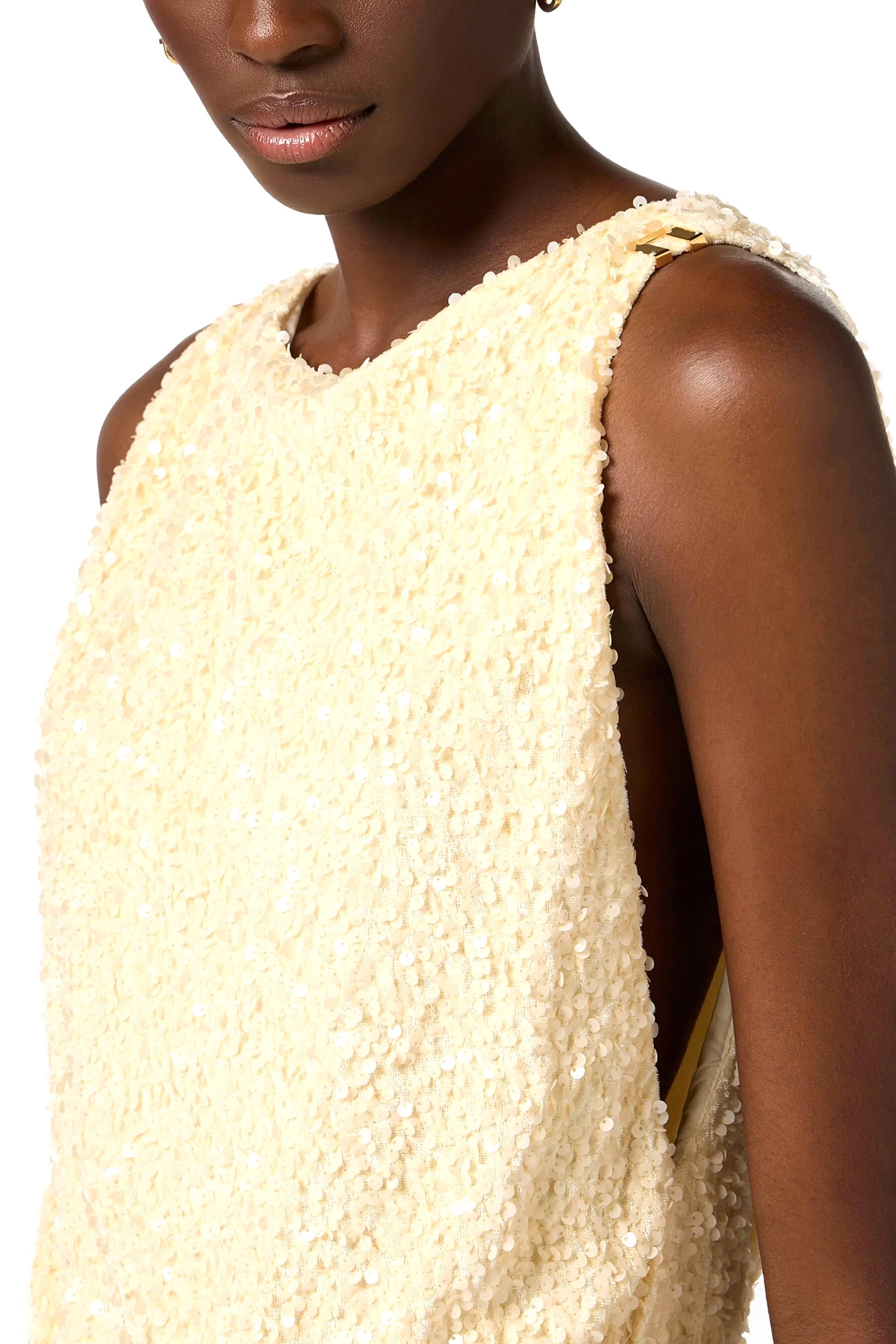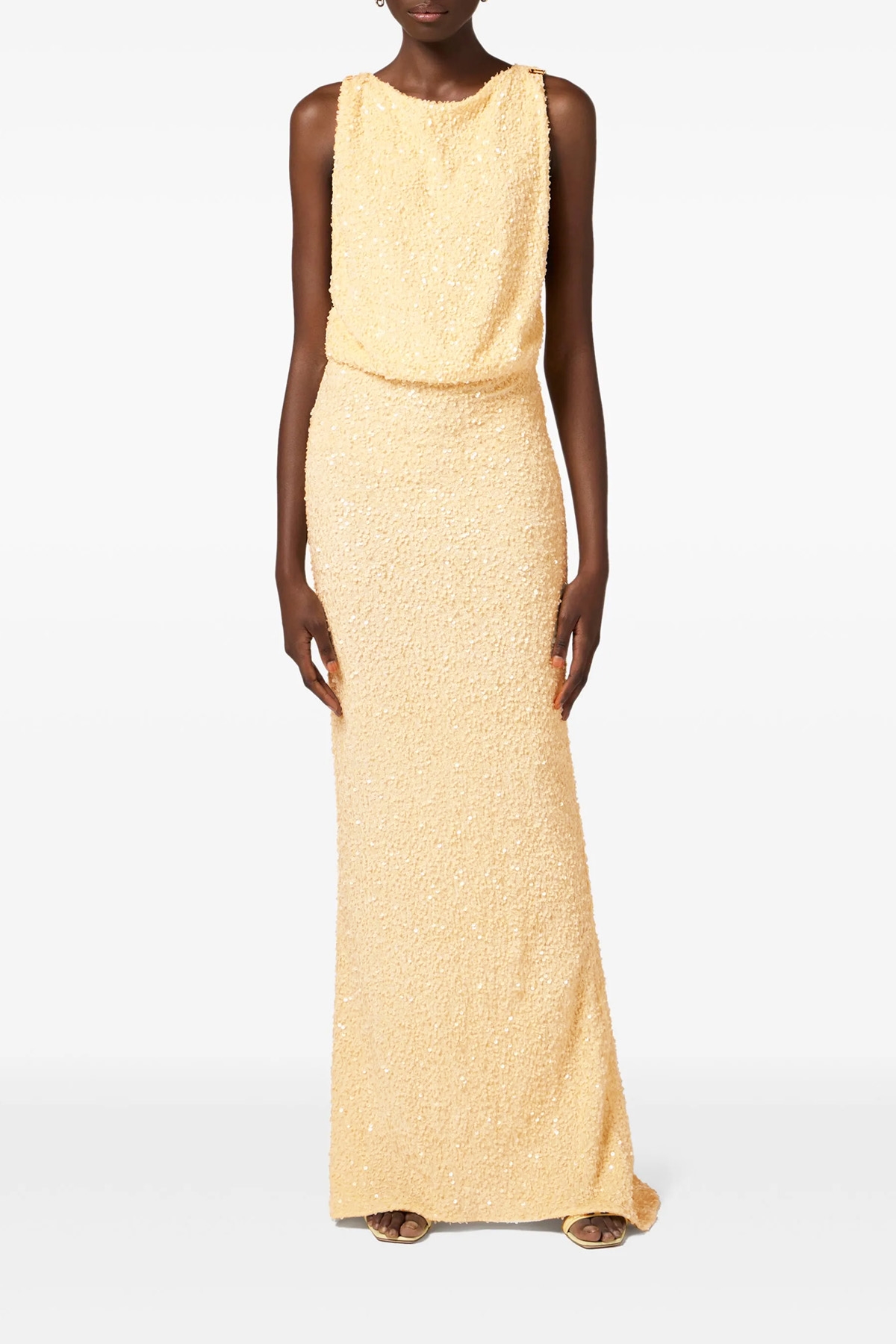 Long sleeveless sequin dress with boat neckline.