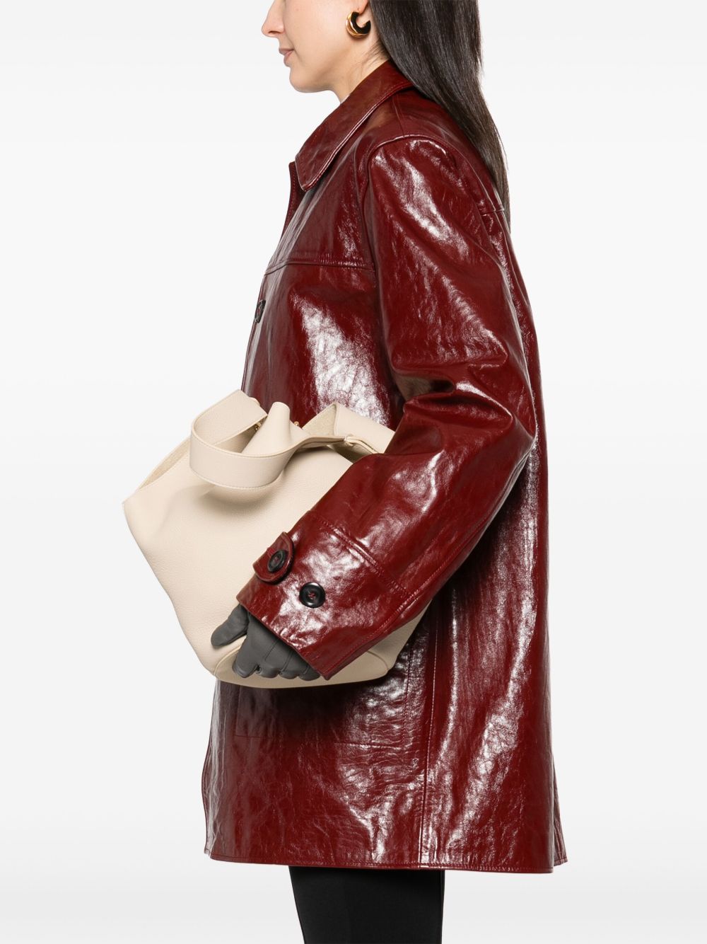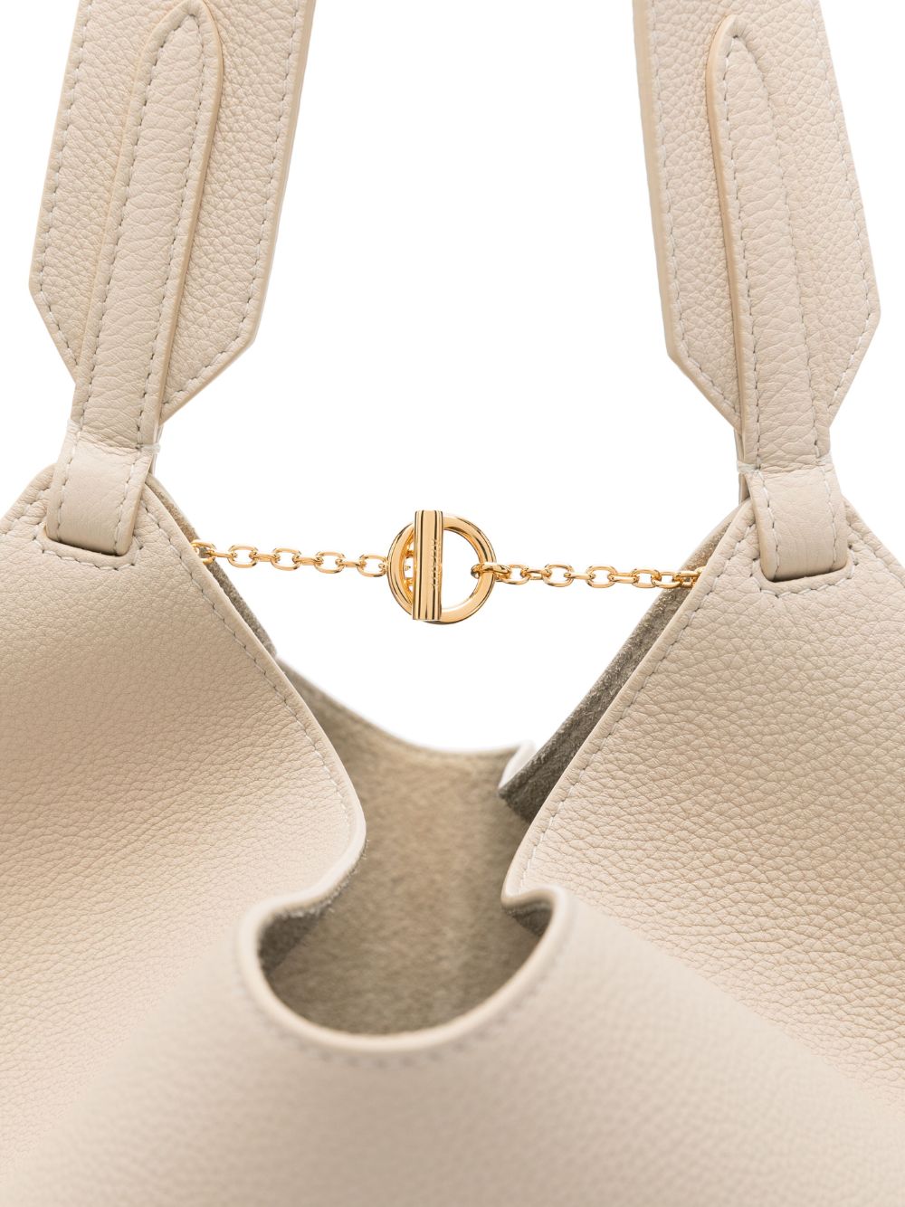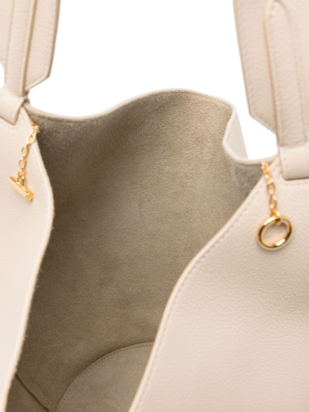 light beige calf leather pebbled texture internal toggle fastening single shoulder strap slouch body logo stamp to the front main compartment suede lining This piece comes complete with a protective dust bag.