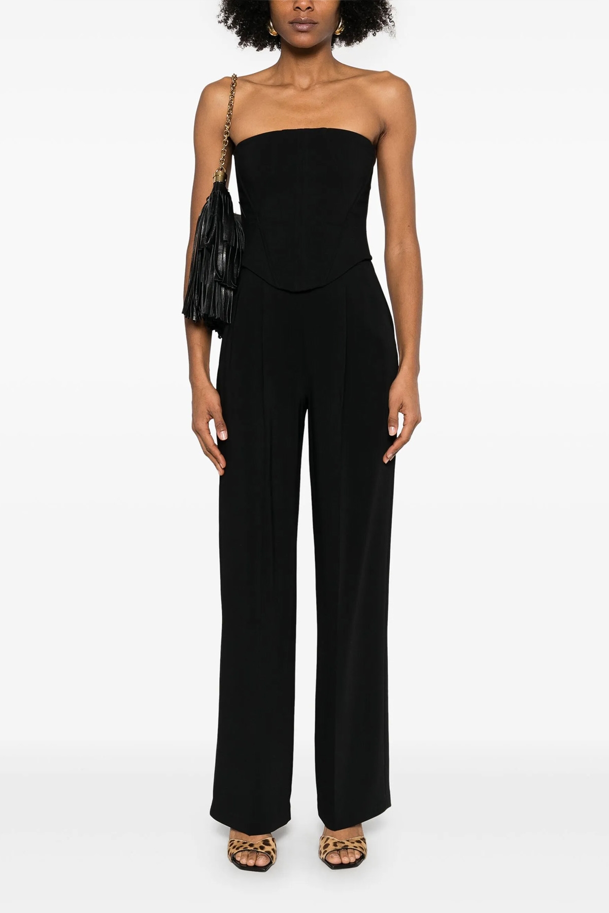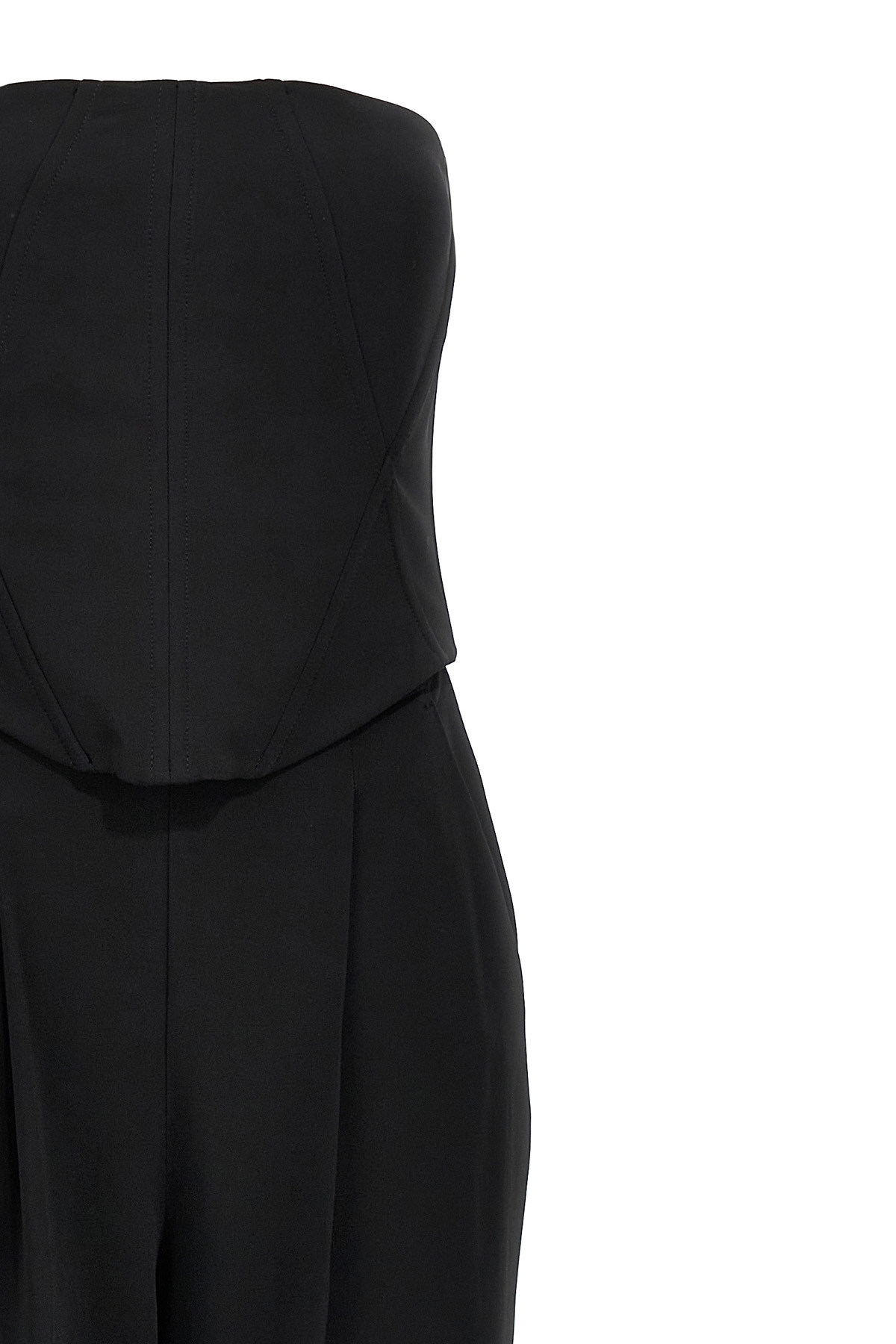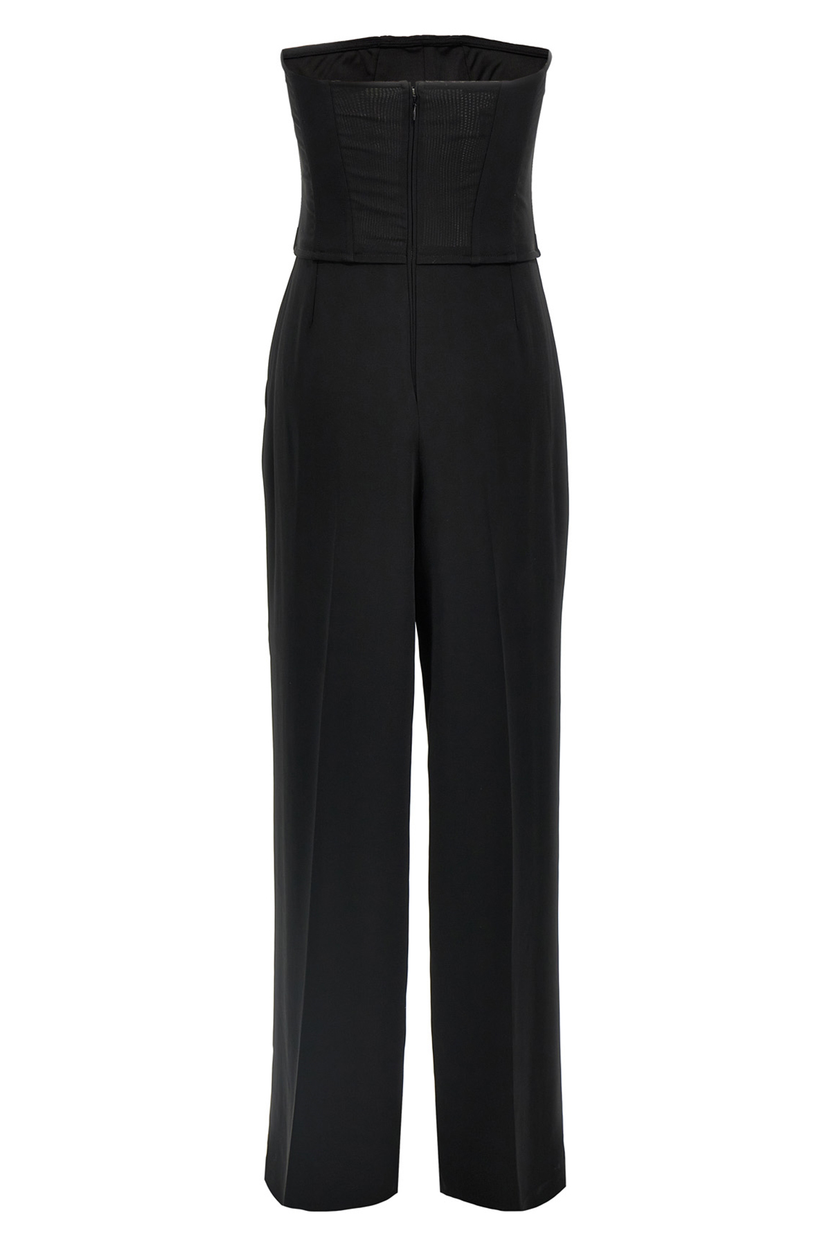 'Gallo' technical cady suit, consisting of a fenced corset and wide pants with pleats. Invisible zip closure.