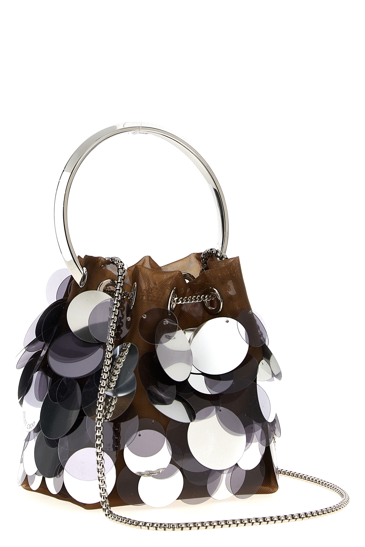 'Bon Bon' mesh handbag with maxi metallic sequins applied, rigid bracelet handle, chain shoulder strap, drawstring closure with metal tassels.