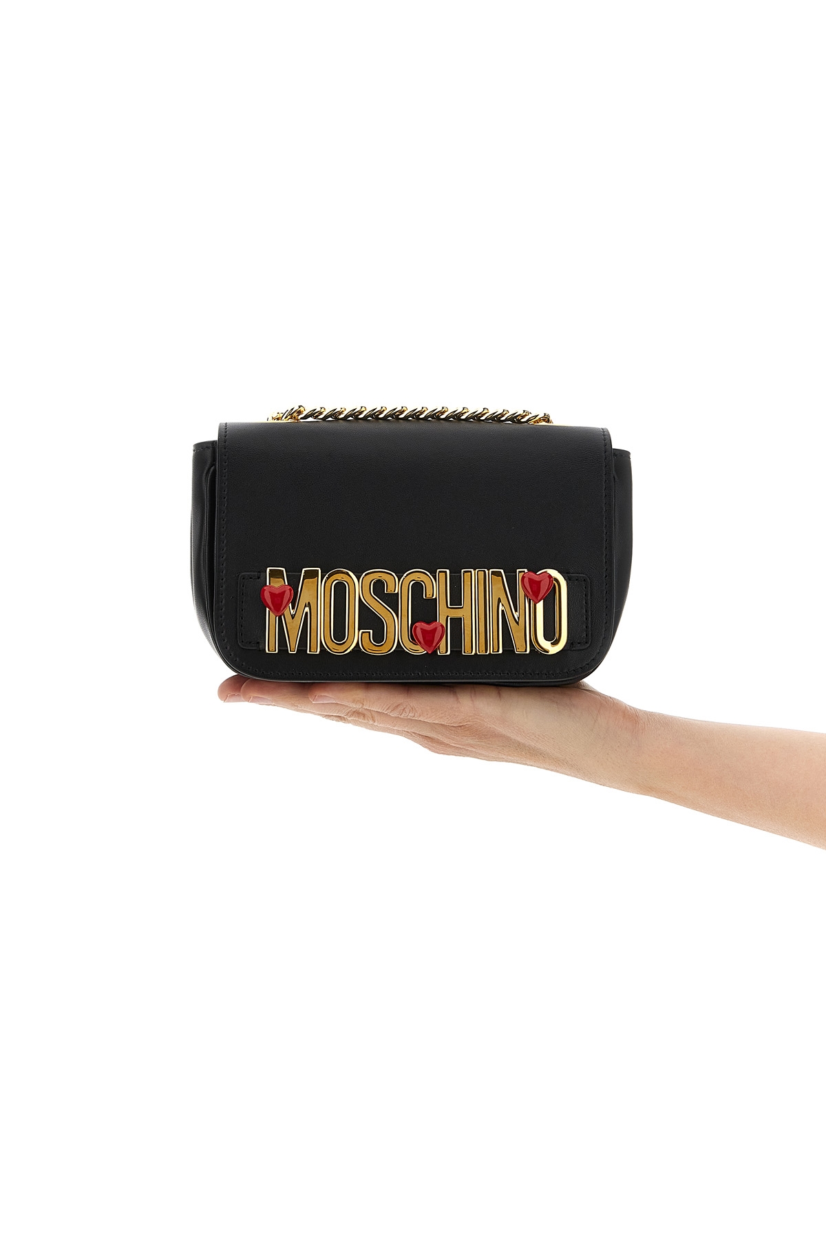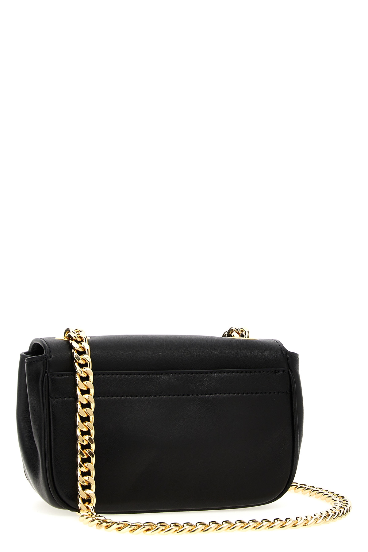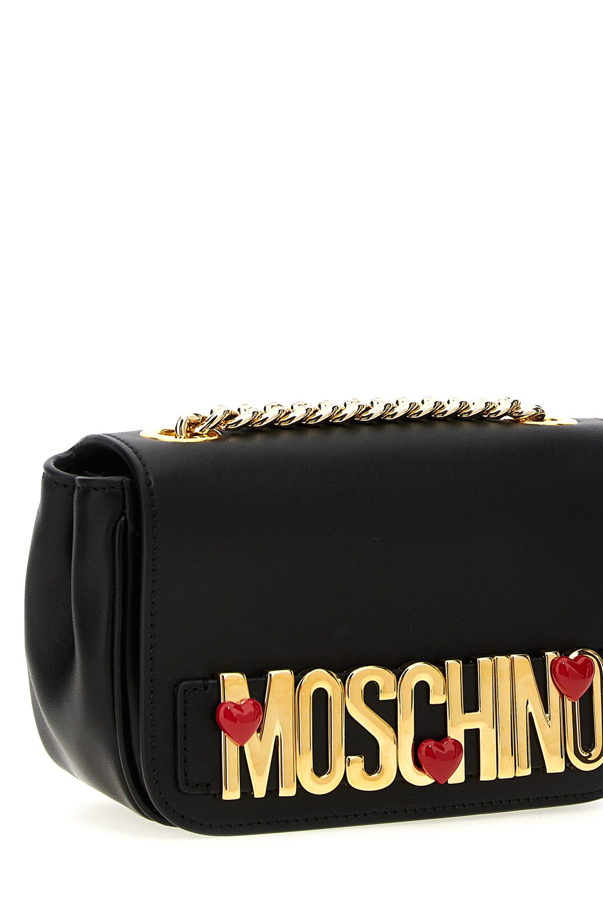 Leather shoulder bag, magnetic flap closure, front metal lettering logo, chain handle, back pocket.