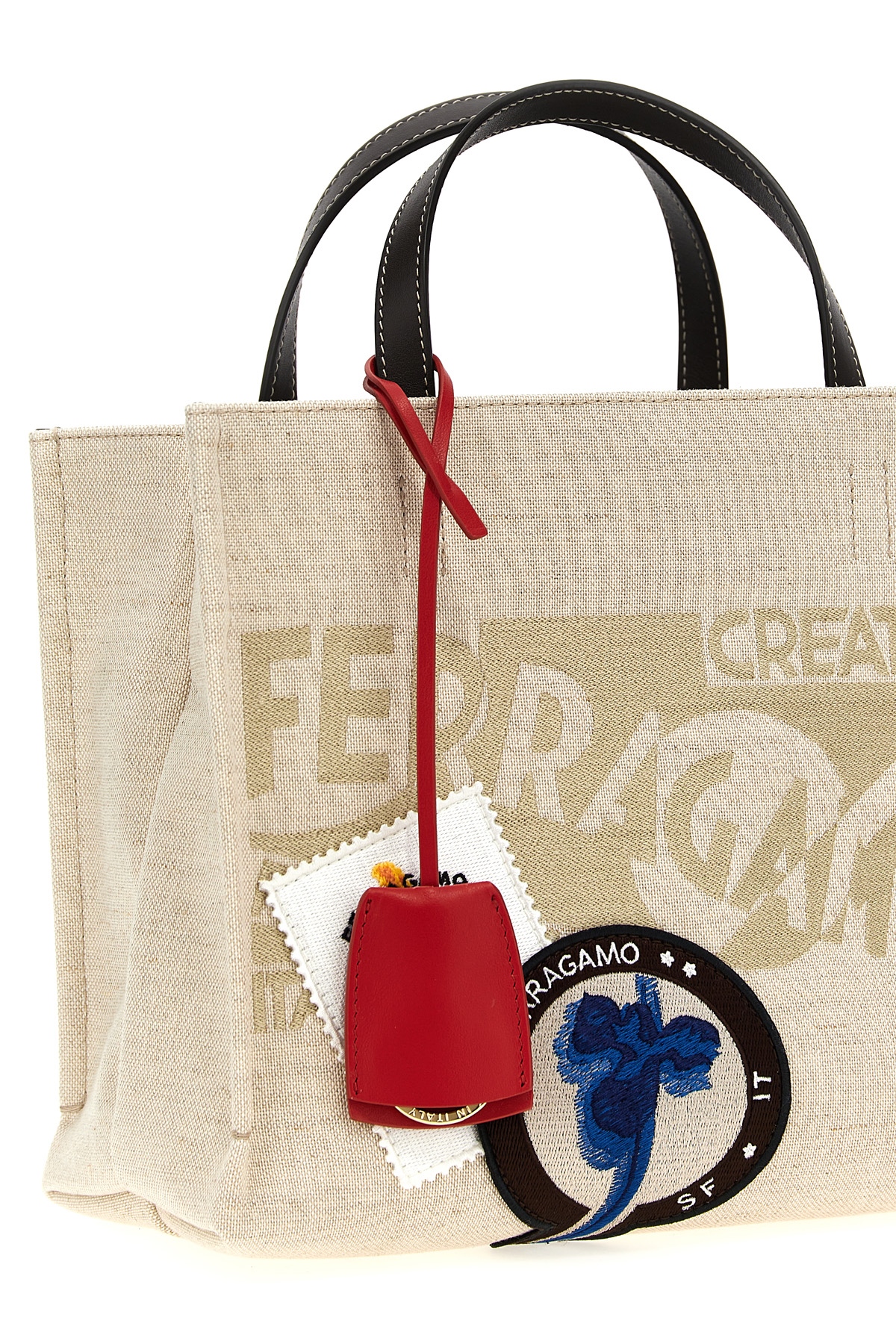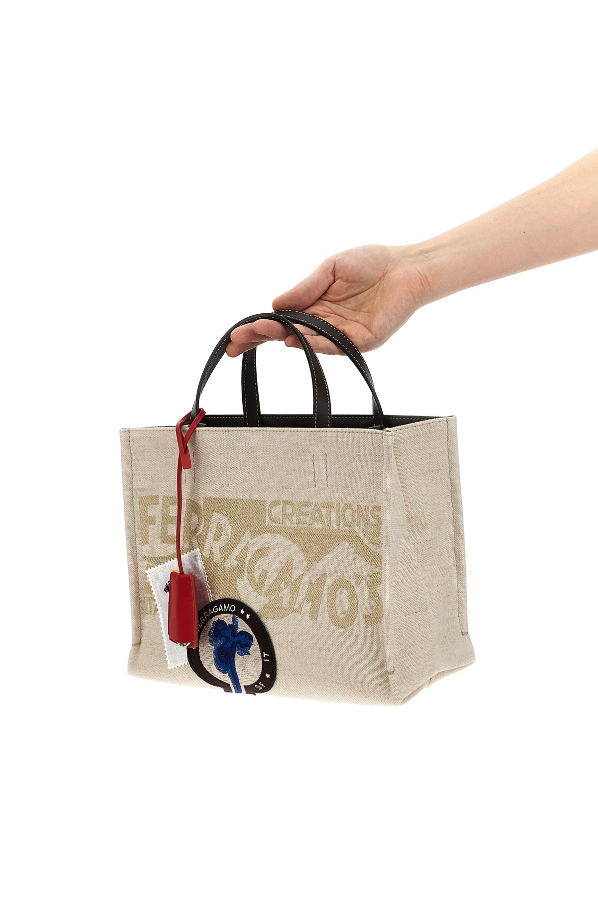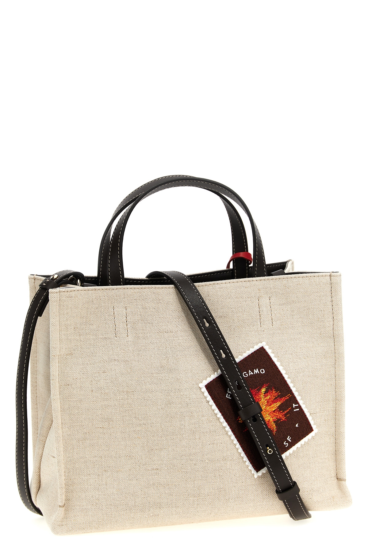 'Tote bag S' jacquard fabric handbag with front and back patch, double fixed leather handle, leather and metal charm keyring, adjustable and removable leather shoulder strap.