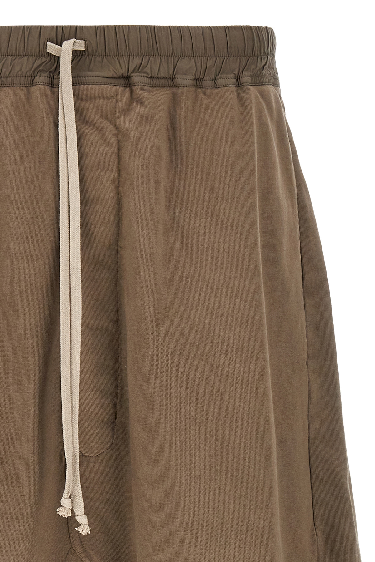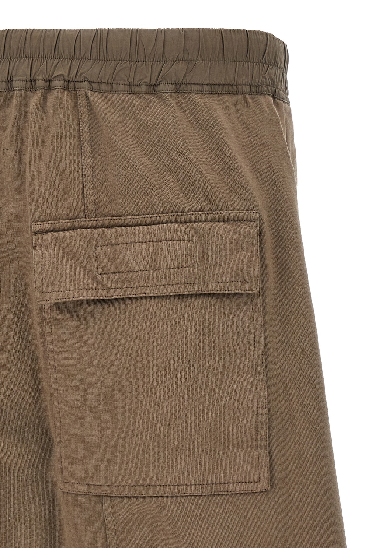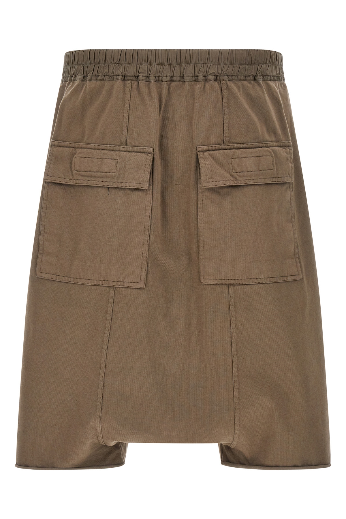 'Drawstring Pods' cotton bermudas, elastic and drawstring at the waist, flap with buttons, pockets, raw cut leg bottoms.