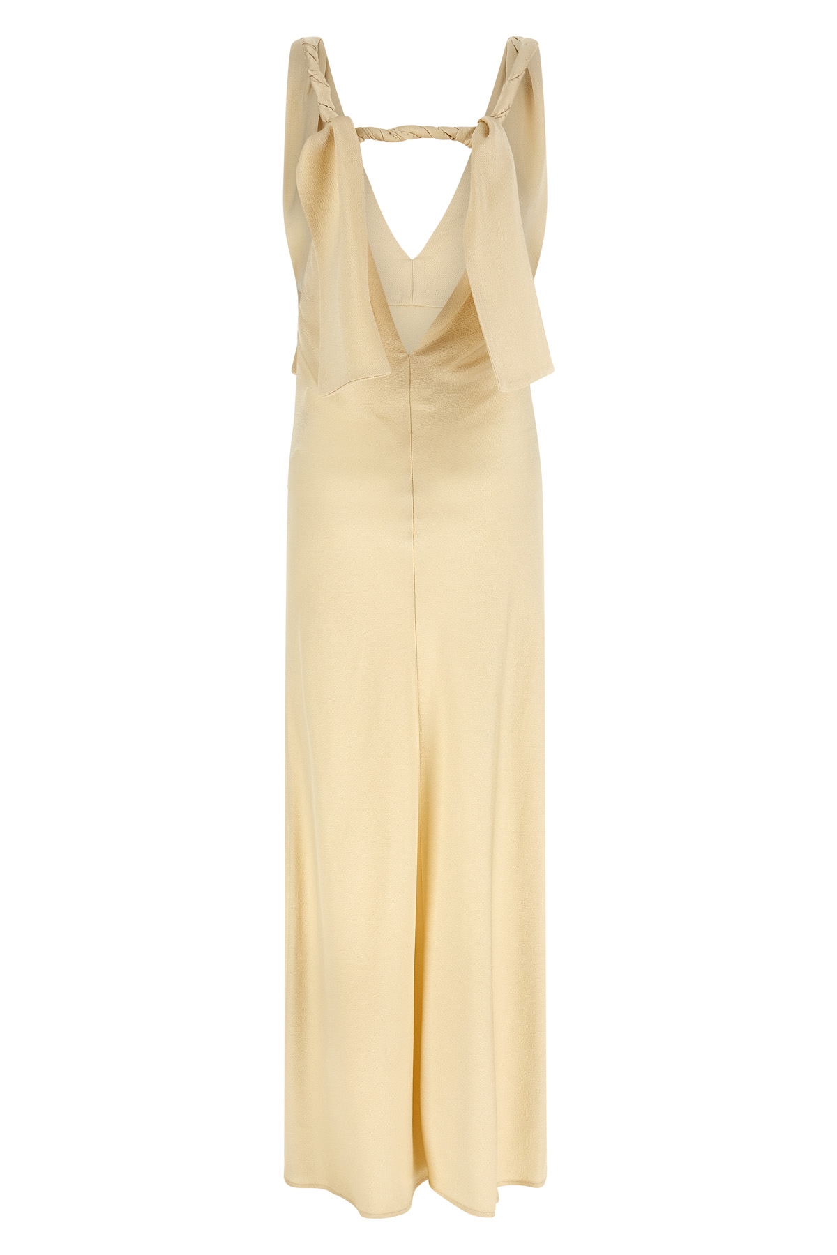 Long 'Livia' viscose dress, V-neck, sleeveless model with twisted shoulder straps, back bow closure, mermaid skirt.