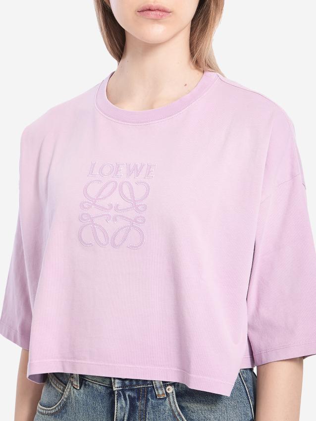 Cropped short-sleeve crewneck t-shirt in lilac cotton. It features a tonal embroidered LOEWE Anagram motif on the front and a ribbed neckline. The