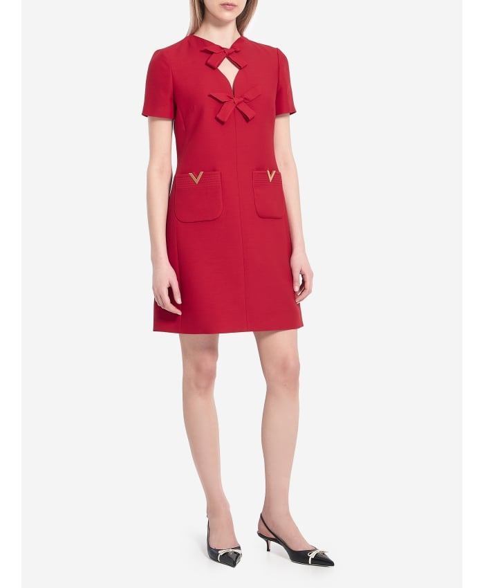 Short short-sleeve dress in red Crepe Couture silk and wool blend. It features bows at the neckline, two front patch pockets with plaque with V Gold