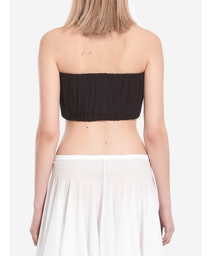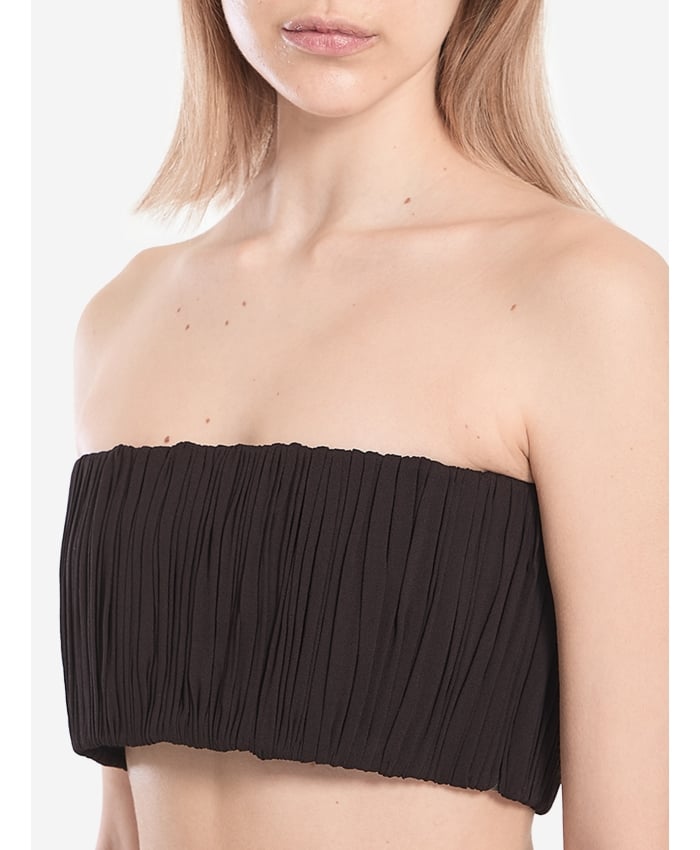 Strapless bralette in dark brown pleated crepe georgette with a bellows effect. It features a side zip closure on the left and two internal strips to