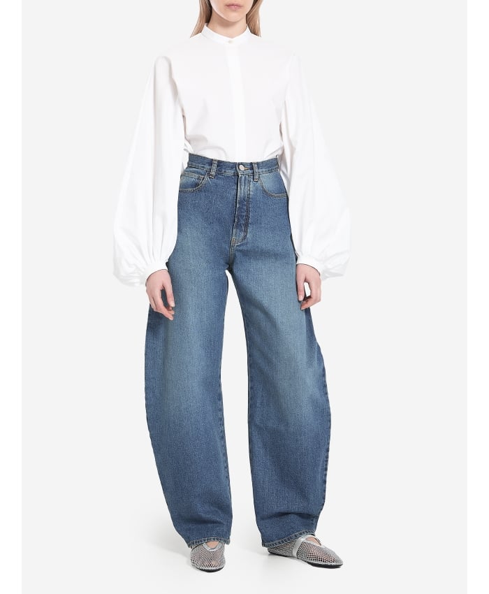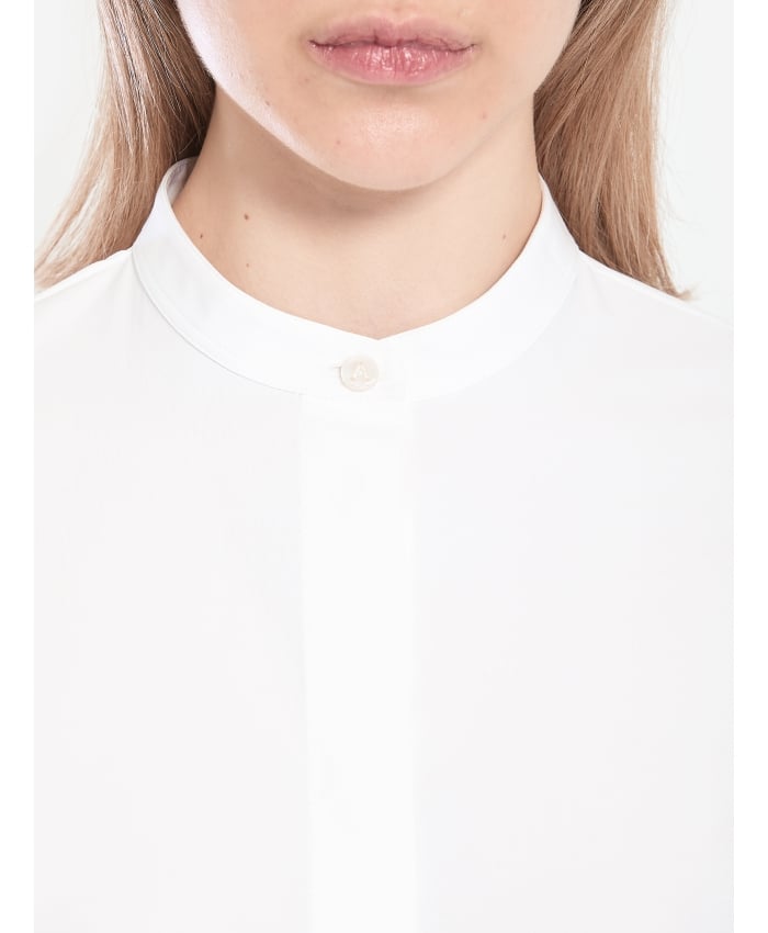 White cotton poplin shirt with long balloon sleeves. It features a band collar, button closure, and voluminous sleeves gathered at the cuffs.The
