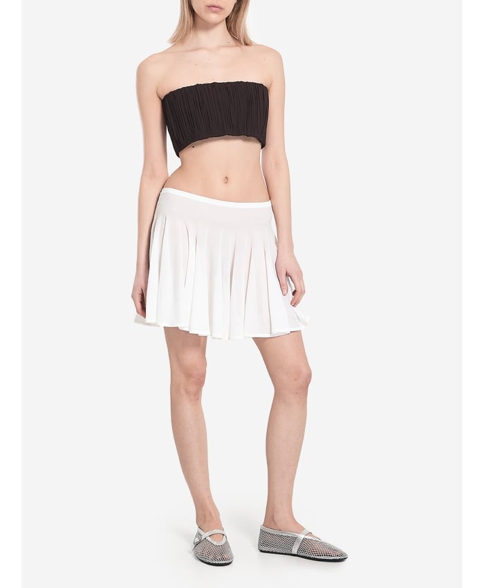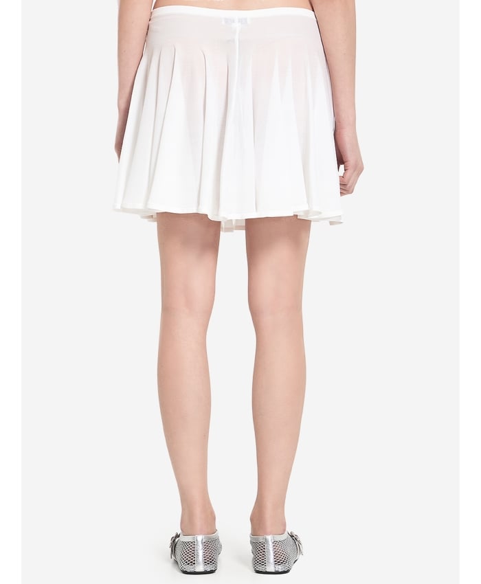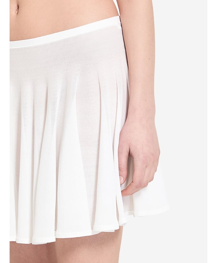 Skater skirt in semi-transparent fine white knit with perforated details. It features a low, thin, and elasticated waistband, voluminous ruffles, and