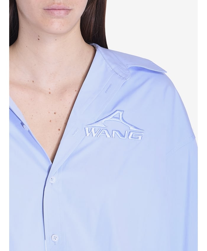 Oversized blue cotton shirt. It features a pointed collar, button closure, tonal embroidered logo on the chest, dropped shoulders, wide sleeves,