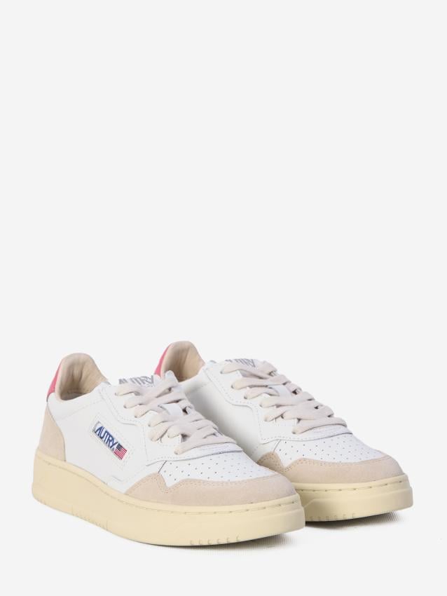 Low Medalist sneakers in white leather with beige suede inserts, a pink detail on the heel, and a rubber sole. They feature a lace-up closure,