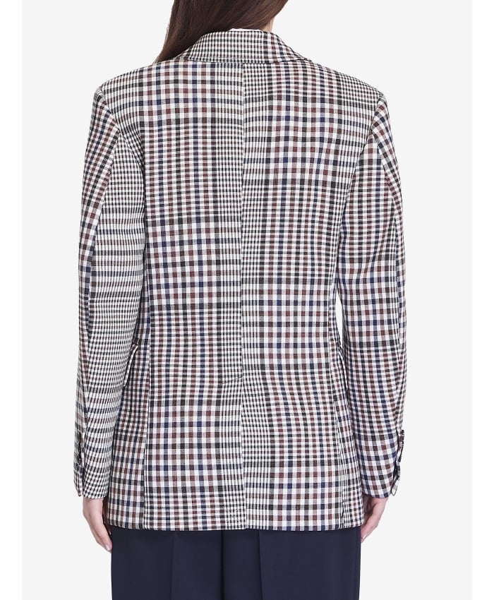 Double-breasted blazer in a structured cotton blend with blue and brown checks. It features a double-breasted button closure, peak lapels, round