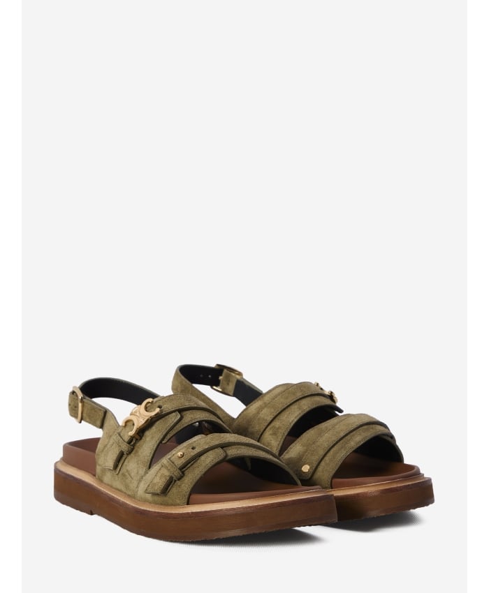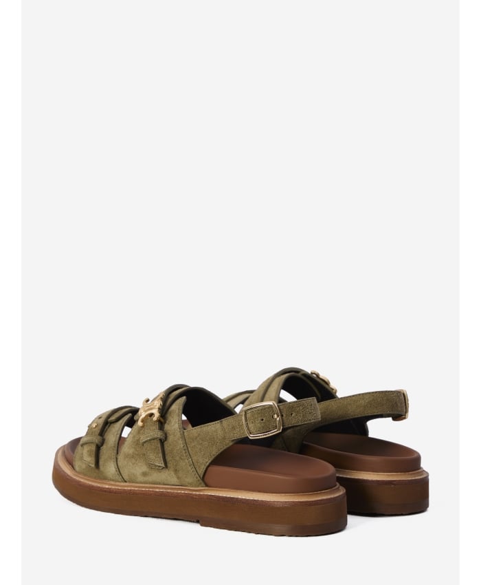 Tippi Triomphe sandals in olive green leather. They feature a closure with an adjustable Triomphe metal logo on the upper strap, an adjustable toe