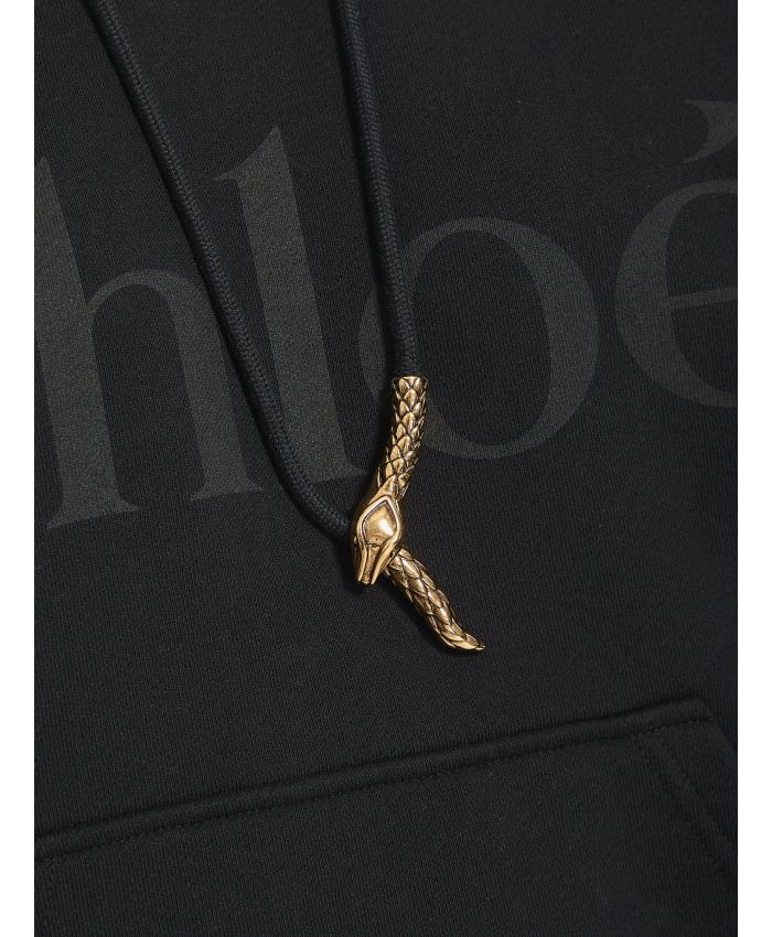 Black cotton hoodie with a tone-on-tone Chloé logo printed on the chest. It features a drawstring hood with snakehead and tail