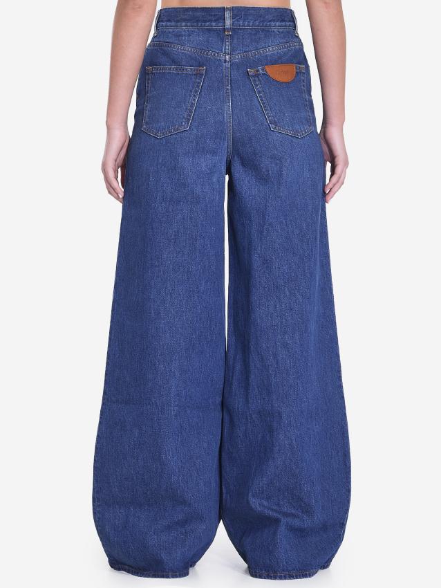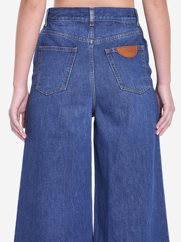 High-rise palazzo jeans in cotton denim with a vintage Night Blue wash. They feature a zip and button closure, five pockets, belt loops, and a
