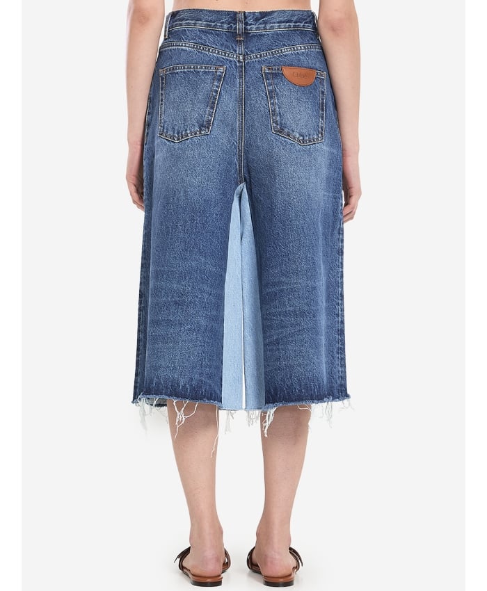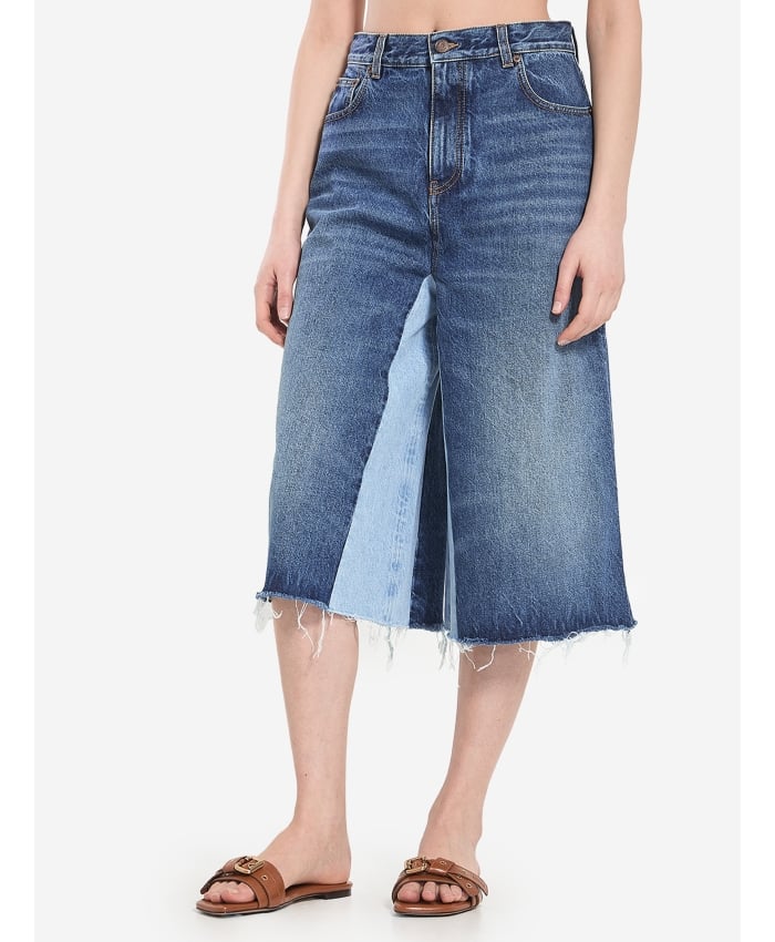 Dark blue denim bermuda shorts with a patchwork detail on the inner thigh in light blue denim. They feature a high waist, a button and zip closure,