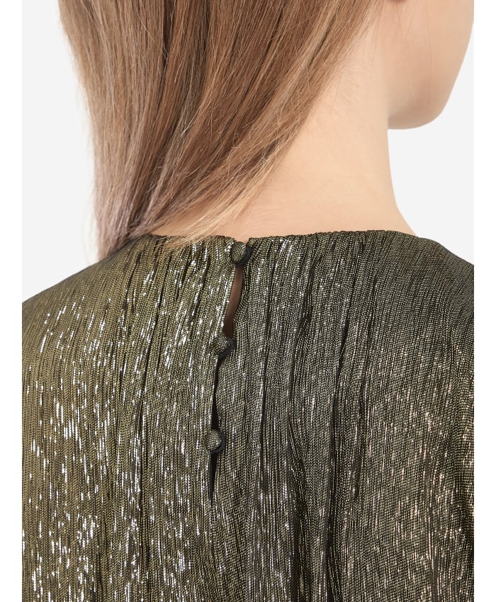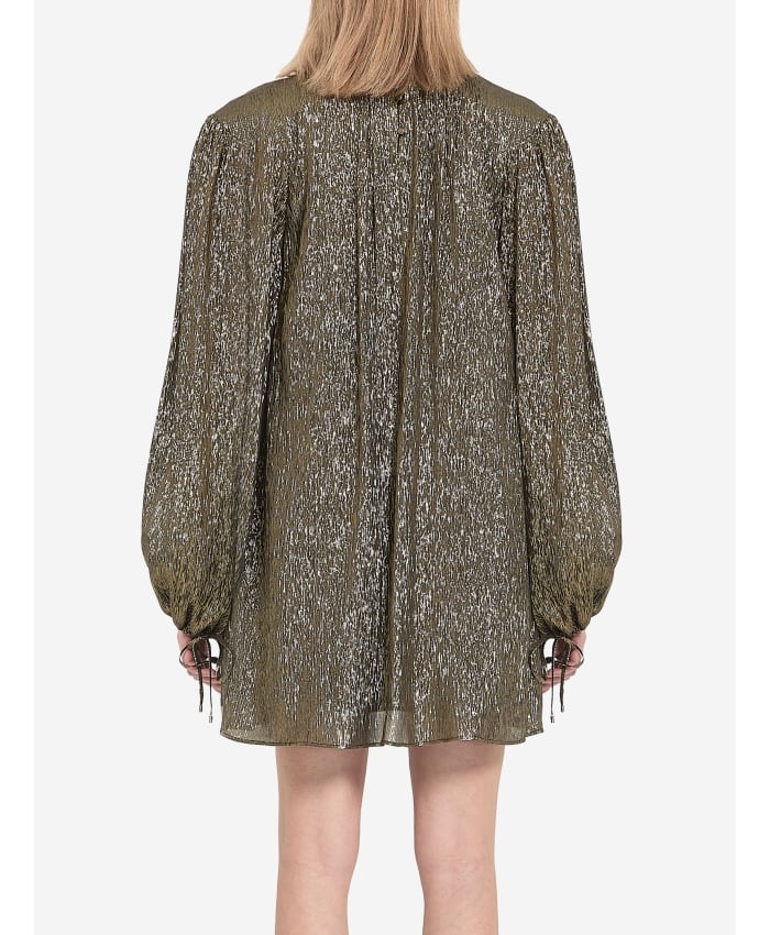Ruched and flowy mini dress in silk crepe blended with lamé. It features a crew neckline, two hidden side pockets, drawstrings
