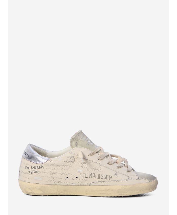 Super-Star sneakers in smooth leather and white suede with a worn effect and writing on the sides. They feature a white suede toe and tongue, lace-up