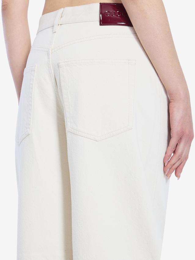 Balloon jeans in ecru cotton denim. They feature a petite fit, a button closure with an engraved logo, five pockets, belt loops, wide legs with