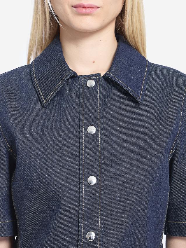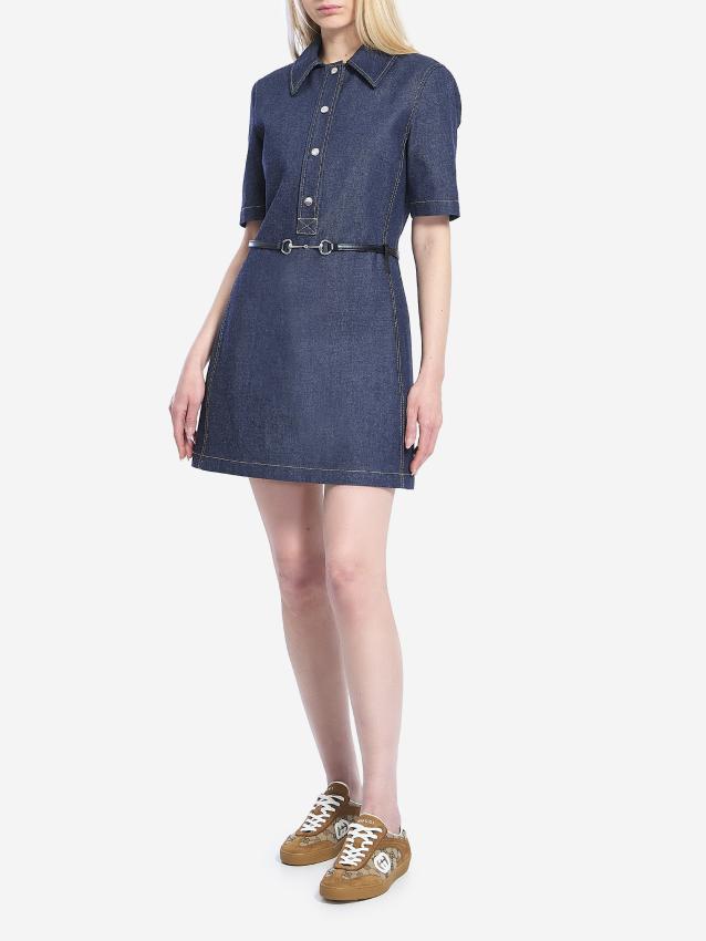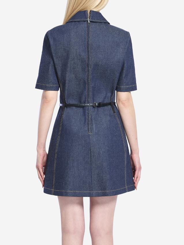 Mini dress in dark blue cotton denim. It features short sleeves, a pointed collar, a front snap-button closure with engraved logo, a removable and