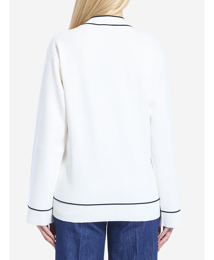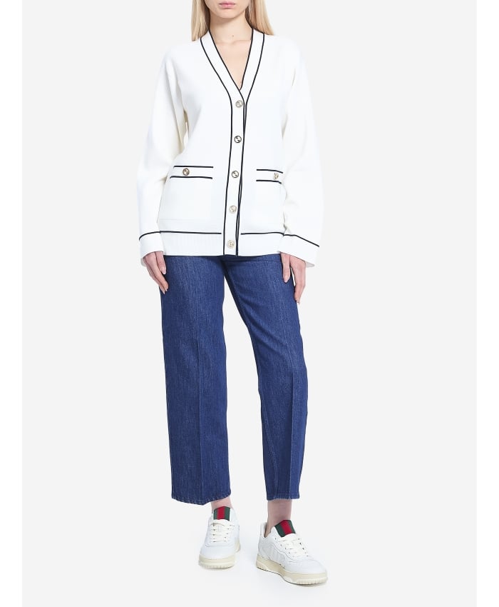 Fine wool white cardigan with dark blue piping finishes. It features long sleeves, a button closure with Round GG Interlocking buttons, dropped