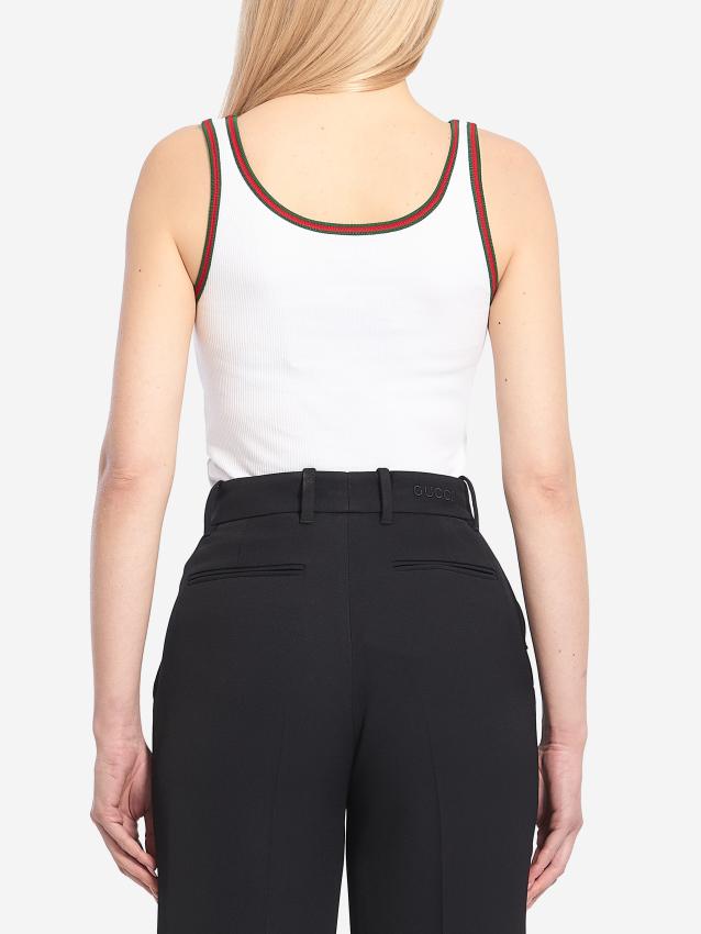 White ribbed cotton Web tank top. It features grosgrain finishes with green and red Web detailing and a tone-on-tone Gucci embroidery on the back.The
