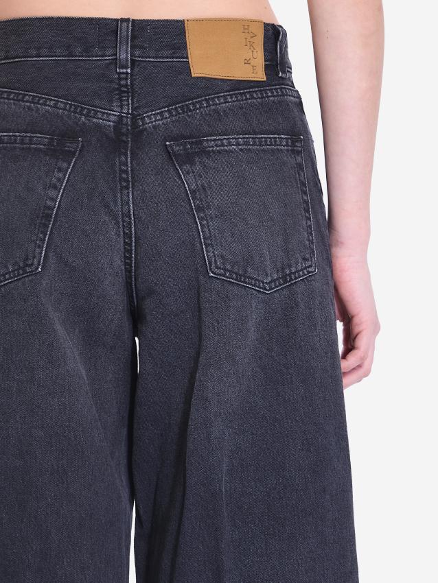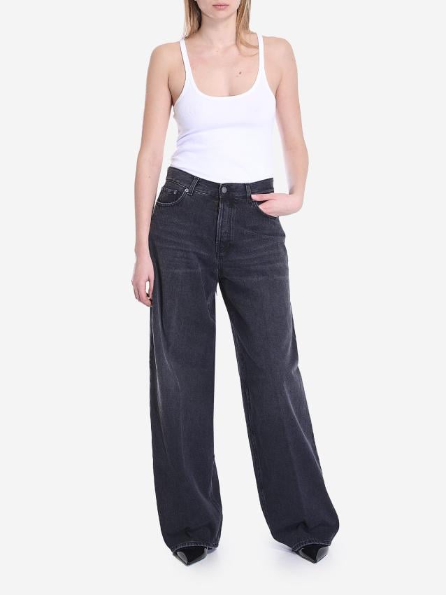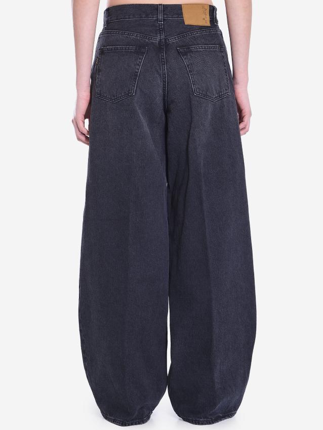 Bethany oversized jeans in mid-black cotton denim. They feature button closure, five pockets, belt loops, a relaxed waist, wide and extra-long legs,