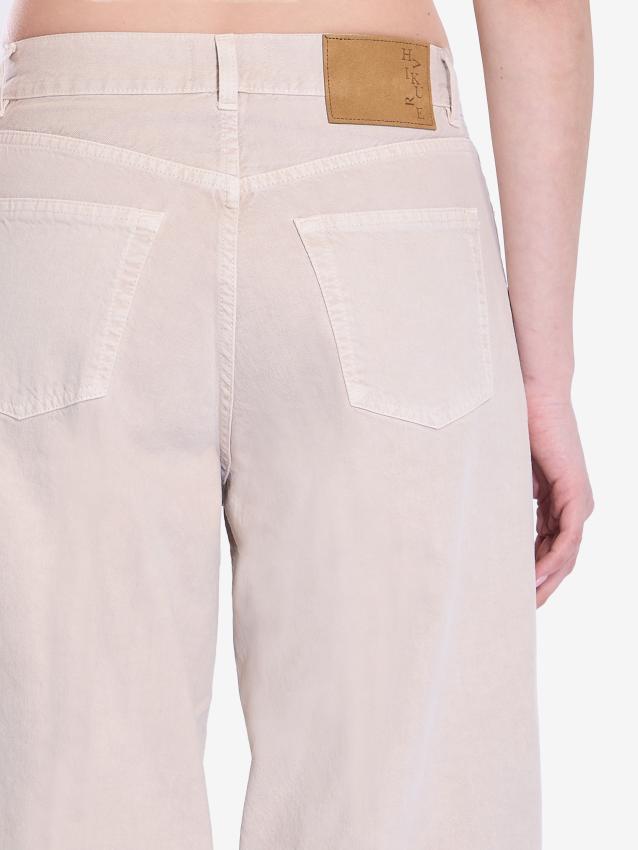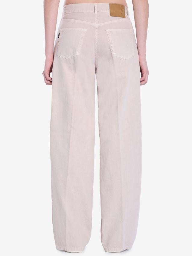 Bethany oversized jeans in beige cotton and linen blend. They feature button closure, five pockets, belt loops, a relaxed waist, wide and extra-long