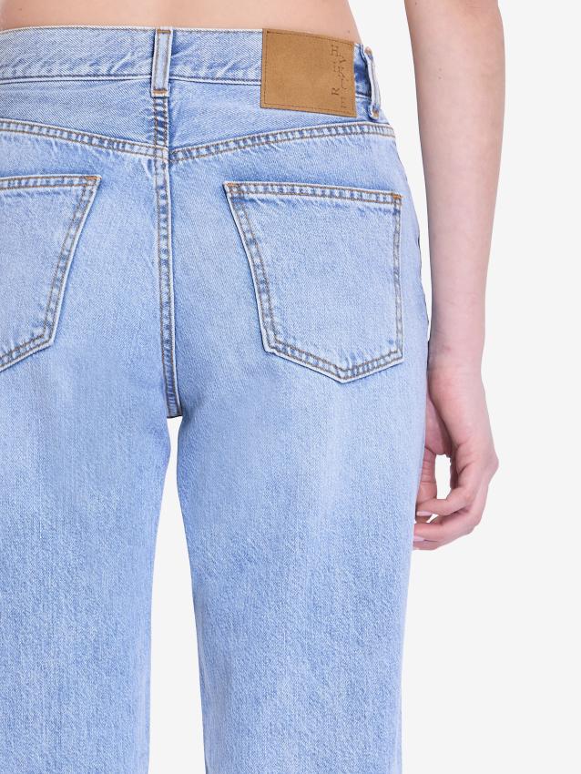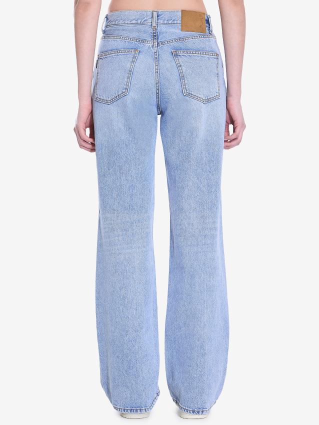 Korea jeans in aqua blue denim with a mid-rise waist. They feature a button closure, five pockets, belt loops, wide-leg design, and a beige suede