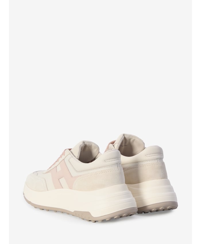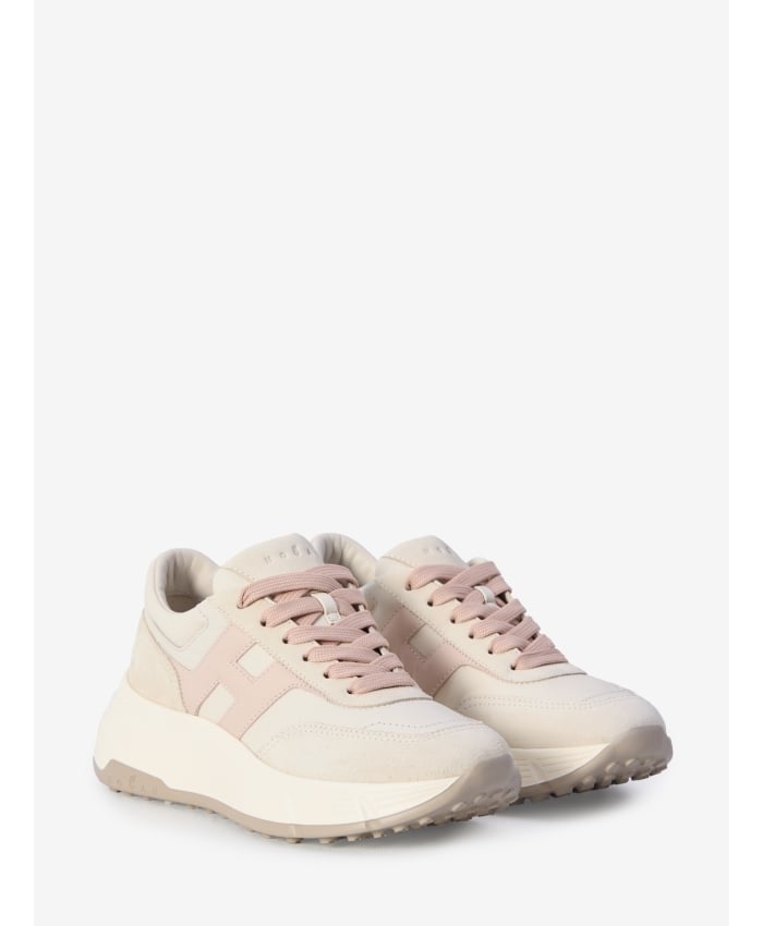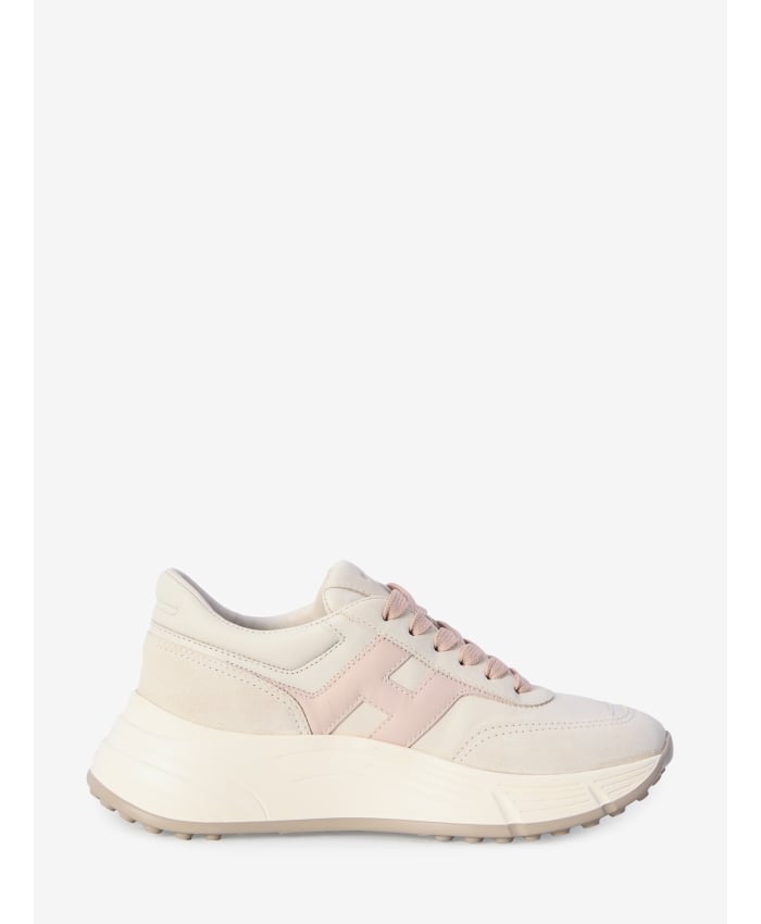 Hogan Hi-Fi sneakers in ivory and pink leather with light grey suede. They feature a lace-up closure, a pink leather H detail on the sides, a beige