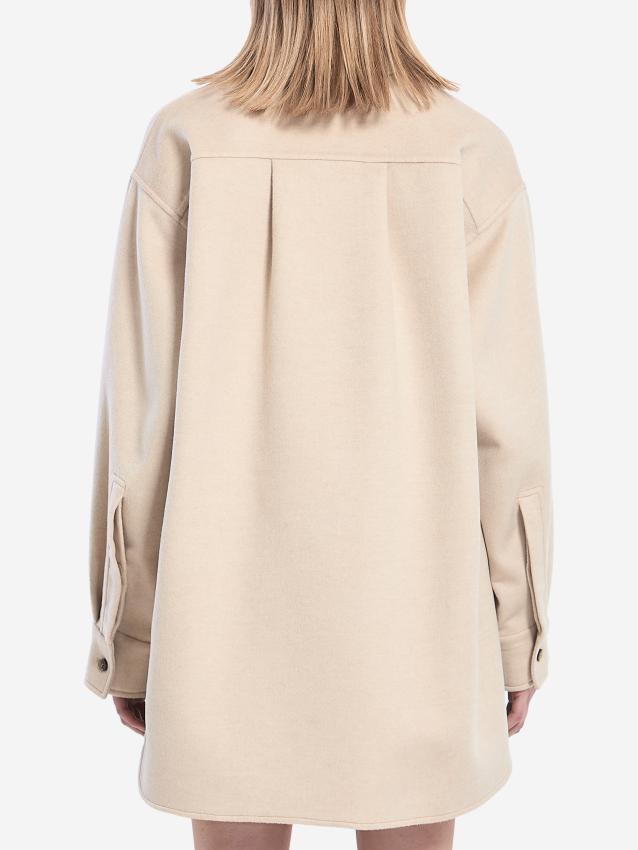 Overshirt in light beige melange wool and cashmere. It features a classic collar, a concealed button closure, a tonal leather patch pocket on the